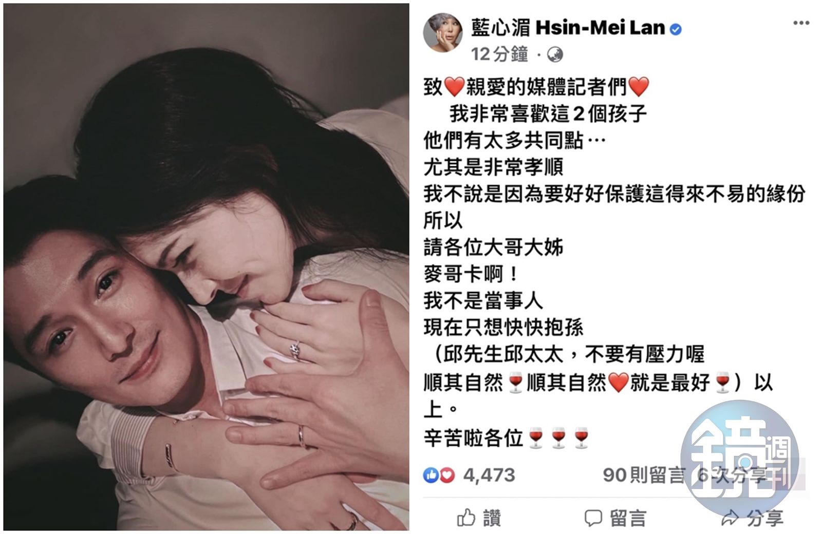 藍心湄在臉書寫下: 致❤️親愛的媒體記者們❤️ 我非常喜歡這2個孩子 他們有太多共同點⋯ 尤其是非常孝順 我不說是因為要好好保護這得來不易的緣份 所以 請各位大哥大姊 麥哥卡啊! 我不是當事人 現在只想快快抱孫 (邱先生邱太太,不要有壓力喔 順其自然🍷順其自然❤️就是最好🍷)以上。 辛苦啦各位🍷🍷🍷