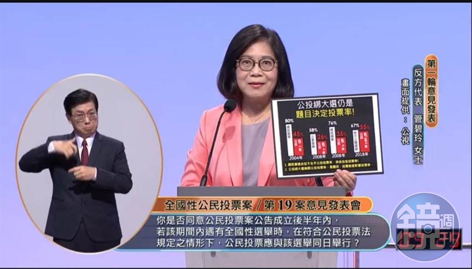 管碧玲說,目前所看到很多民調顯示,預測今年投票率可能不會少於55%,公投投票率是因為題目而有高低,且綁大選每一次投票率都還是高高低低,並提及2018年投票亂象,甚至還發生棄保現象,導致某些政治人物無法接受選舉結果,致使公投綁大選變成「公投亂大選」,直言這些都是不堪回首的政治制度亂象。管碧玲也以過去的統計顯示指出,即便公投綁大選,投票率仍然是題目導向,顯示重點不在綁不綁大選,而是題目是什麼,這點我們能從2018年的公投投票率比往年還高可見。