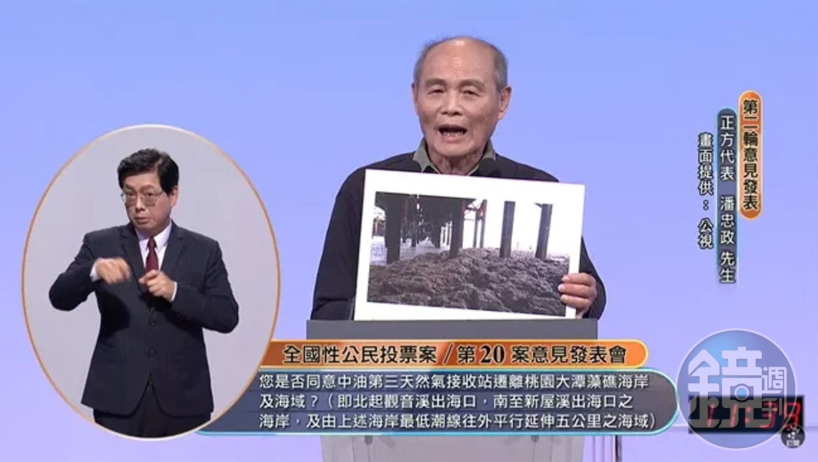第二輪正方潘忠政一開始,就拿出「三接的鋼樁插在藻礁身上」的照片,表示當時海平面退了2公尺,發現第三天然氣接收站蓋在藻礁,直指該照片戳破了政府的謊言。潘忠政認為過去大家為石虎走上街頭抗議,這次大家也應該為了護藻礁投下同意票,並呼籲大家不要放棄個人權益,因為不投票會讓政府認為對該政策無意見,提醒大家應為了藻礁投下同意票。