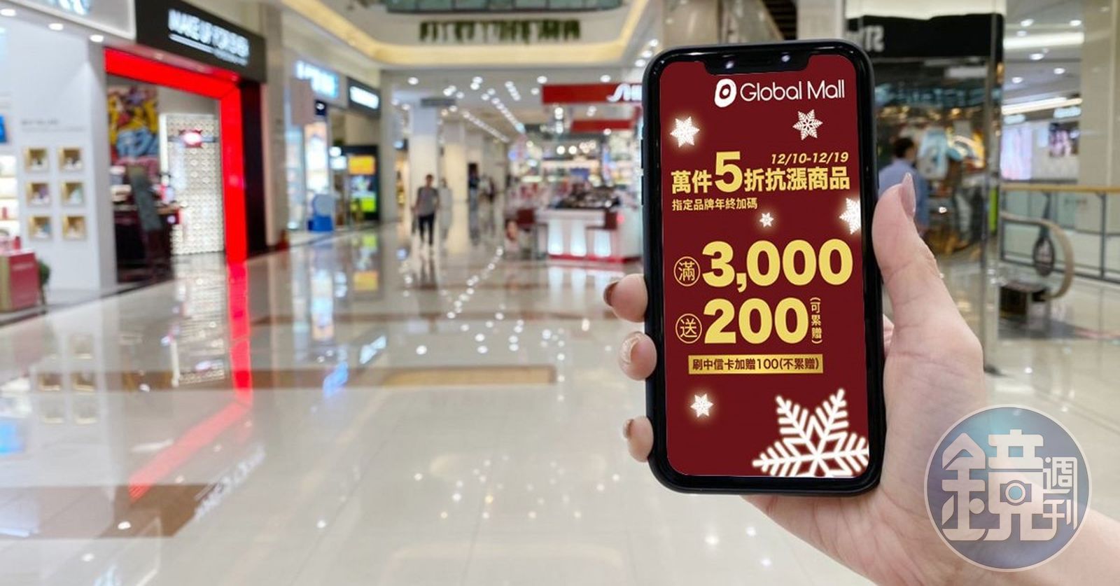 此外,12月20日至25日單筆消費滿額,Global Mall讓消費者點數放大抵, 100點即享折抵100元(一般為100點折抵30元);12月15日前iMall會員使用台灣Pay當日單筆消費滿500元,即可獲100元電子商品禮券;12月25日前持紙本消費券,不限金額消費,週週抽萬元禮券,讓消費者聰明買、將錢放大用。