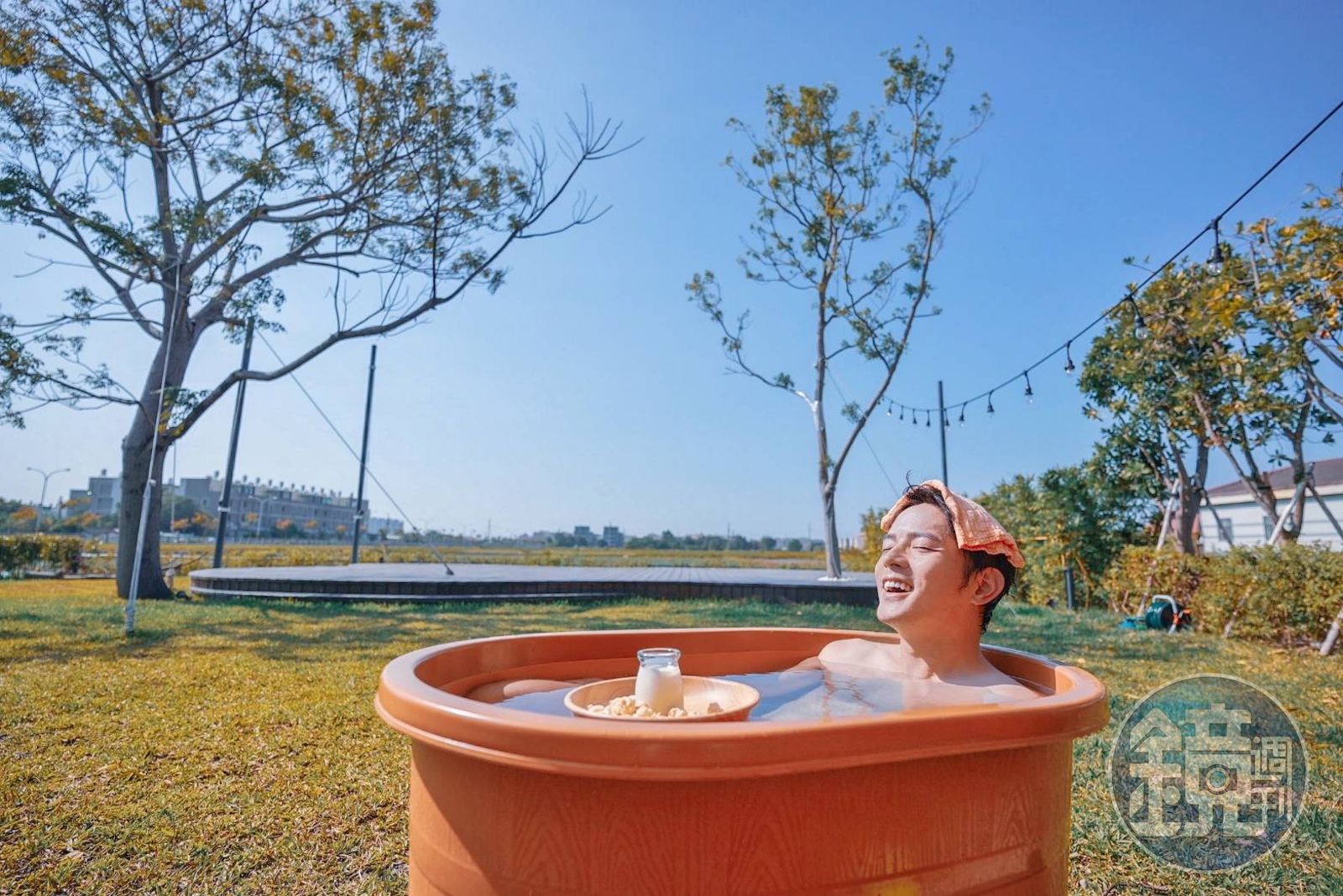 宥勝在戶外設計沐浴設備享受大自然。(喜鵲提供)發布時間:2021.12.13 11:06 臺北時間