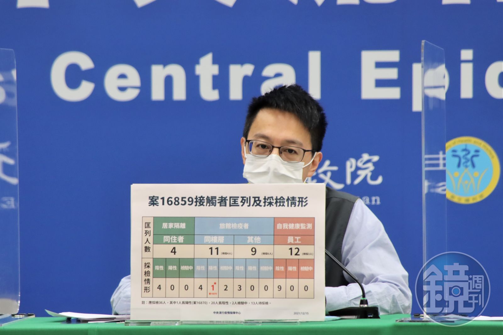 而日前在解隔離後才被驗出染疫的案16859,羅一鈞也說明疫調情形,個案在境外移入解隔離回家後,第3天出現症狀確診,目前匡列同住者4人居家隔離,採檢鈞為陰性,個案隔離時居住的防疫旅館同樓層匡列11人,目前4人陰性、1人陽性,為今日公布之案16870,防疫旅館另有9人被匡列,3人陰性,還有12人自我健康檢測,9人陰性,會陸續安排採檢。