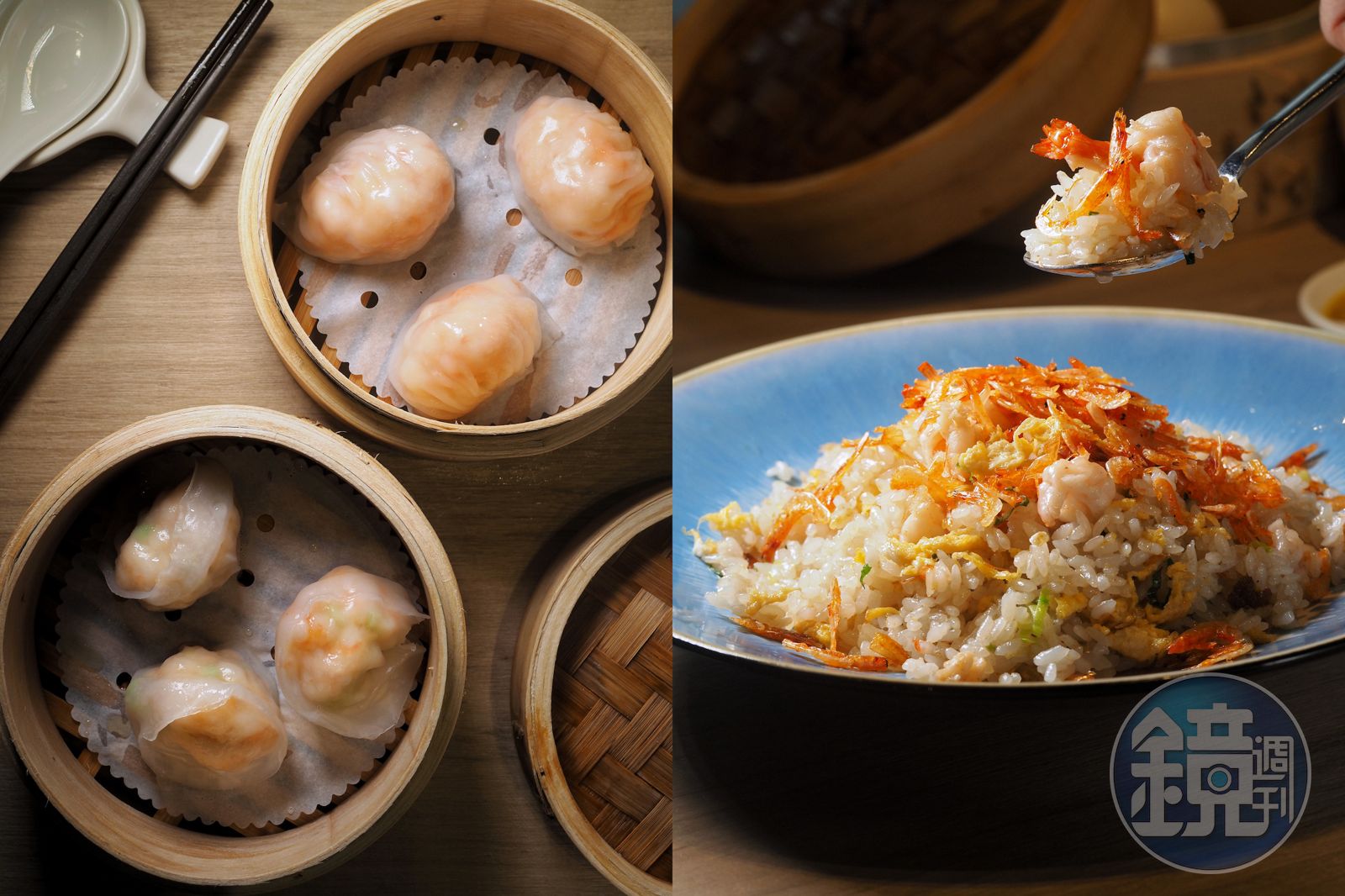 「香茜腐皮卷」炸功優秀,外皮薄酥乾爽,入嘴不會油汪汪。(148元/份) 「芙蓉櫻花蝦餅」是以櫻花蝦拌雞蛋豆腐製成,外酥內滑,鎖著滿滿海味。(148元/份)「櫻花蝦鮮蝦炒飯」用台灣米炒出不輸絲苗米的鬆爽,並加入蝦油呼應兩種蝦的鮮香。(320元/份)除了常見的蒸鳳爪、蒸肉排,帶點客家風情的「酸菜肥大腸」甘酸濃郁、腸體Q而不韌,讓人很想來杯啤酒(可惜沒有);用芋籤層疊蒸成、不摻粉的「鬆化芋頭角」鬆棉夾Q,是芋頭控必點;「臘味蘿蔔糕」裡的蘿蔔不是細籤,而是不規則塊狀,吃來口感豐富,一咬沁出蘿蔔汁。