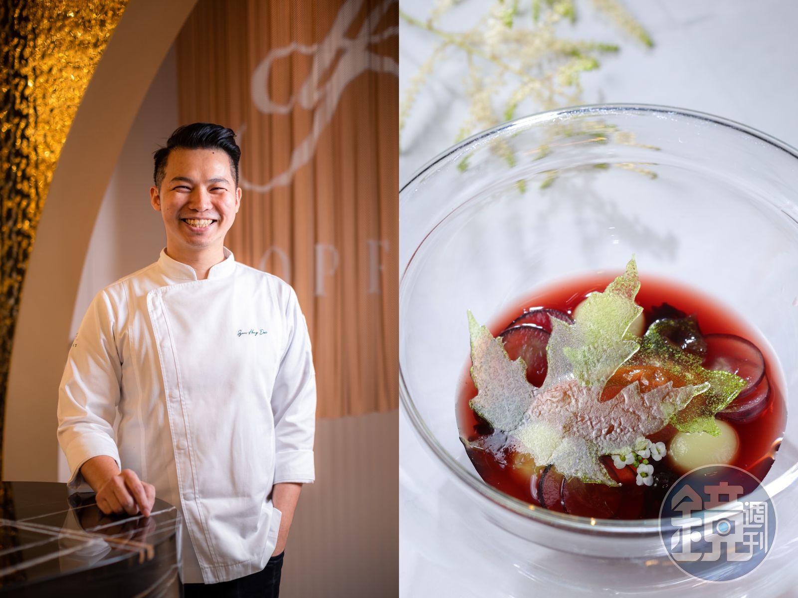 另一道「番茄」則讓戴峻弘克服自己的心魔,「我很怕番茄皮帶來的澀感和土味。」於是他將黑柿番茄去皮滴出澄清湯,並加入義大利苦艾酒做成果凍,覆盆子、草莓做的莓果冷湯包進可可脂裡喬裝成「小番茄球」,敲破莓果球配著清湯凍吃,少了惱人的酸澀,只有番茄濃縮過後的甘鮮甜美。從這道精緻的甜湯可知。火車已載滿修煉的成果,朝自己的路邁進。