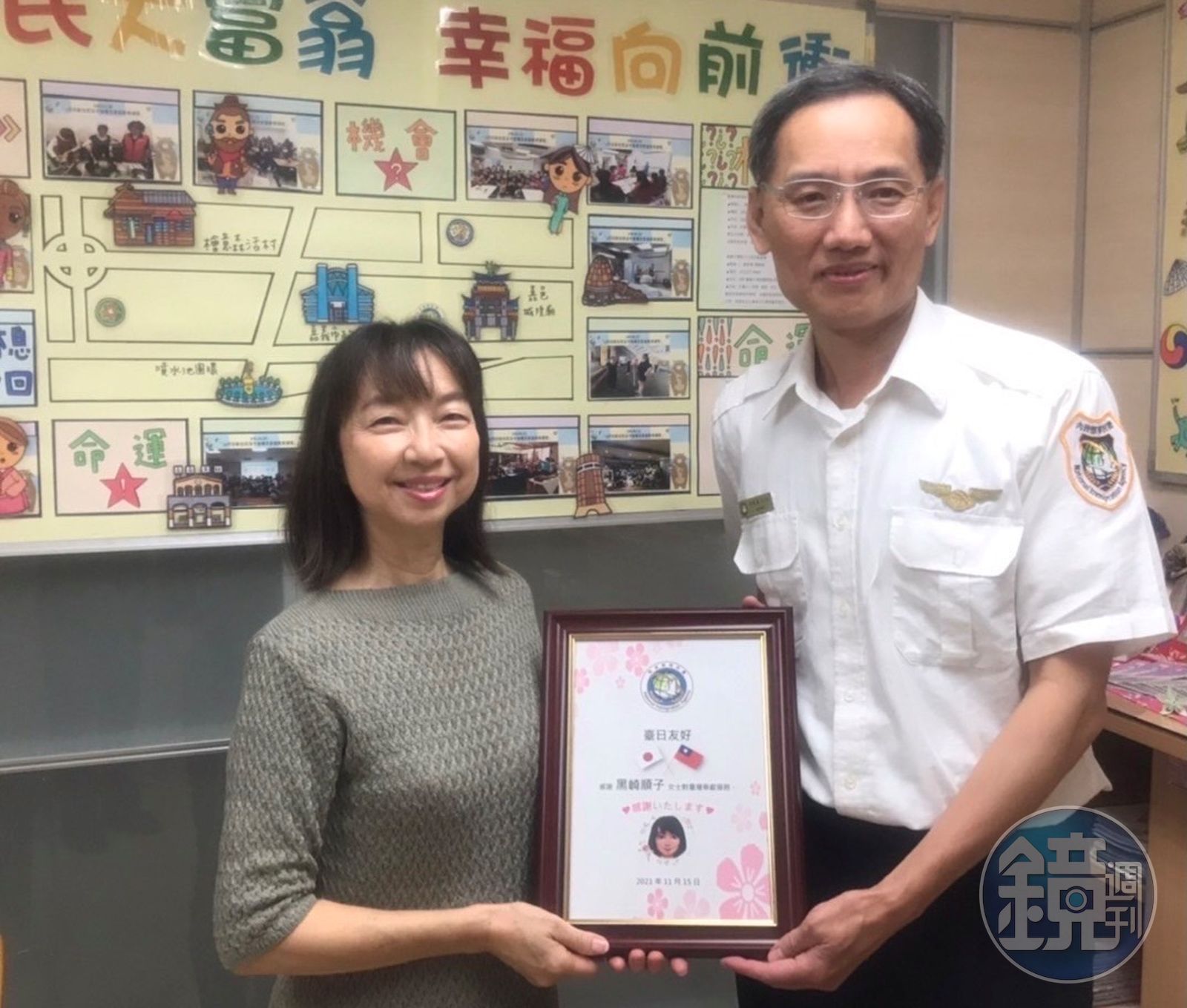 黑崎老師對於台灣日語教育的長期貢獻,經衛生福利部審核符合「馬偕計畫」資格,將提供大眾交通工具、娛樂設施等優待,移民署南區事務大隊嘉義市服務站特別頒發新增註記的永久居留證,並致贈感謝狀。