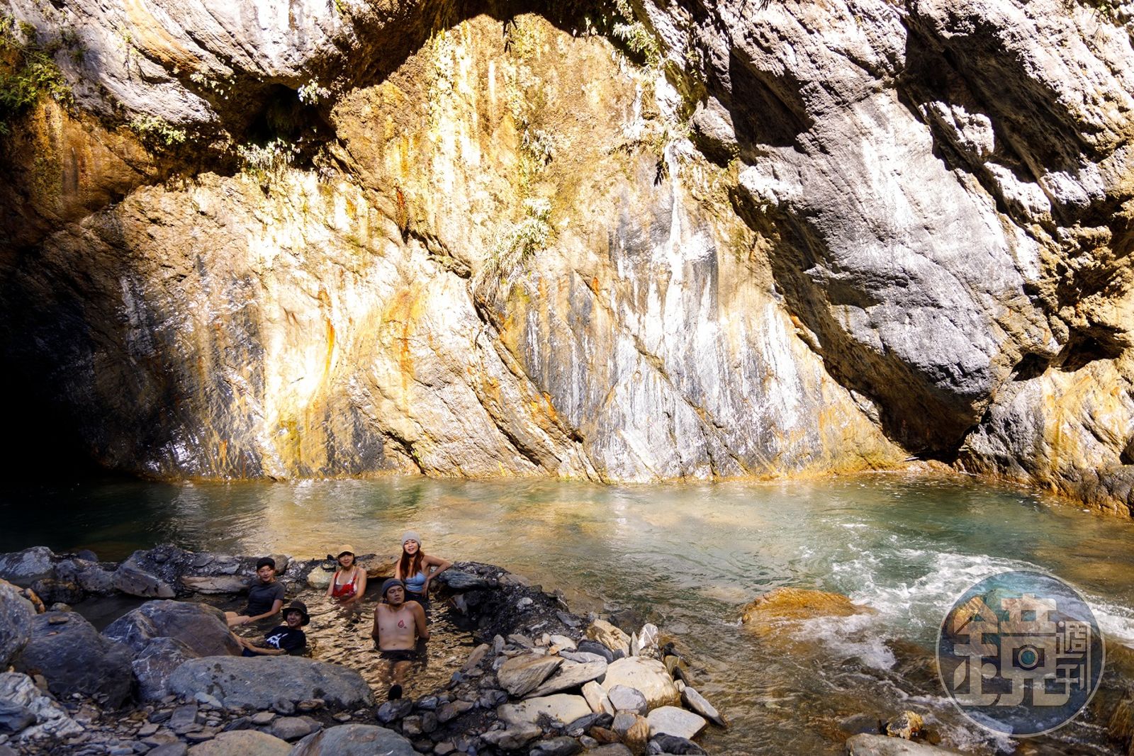 營地距離野溪溫泉極近,池邊可見其他湯友以大石搭建的溫泉池,約步行約10公尺就有可以獨享。嚮導在池水中鋪上帆布,以避免入池時腳底刮傷,夜間無燈的山谷,伸手不見五指,我們脫光衣服跳入溫泉池中,一抬頭,山裡的無暇星空出現在眼前。