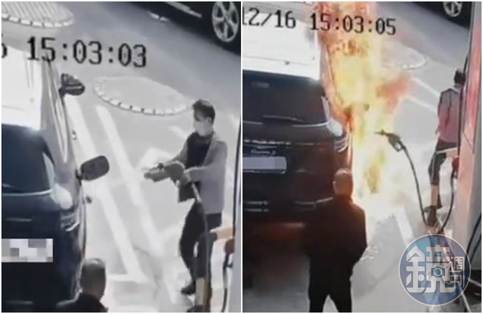 綜合中媒報導,這起事件發生於本月16日下午3點左右,當天一輛保時捷駛入加油站內加油,一名戴著口罩的男子伺機在旁,趁四下無人注意之時,強行拔起油槍,並從口袋掏出打火機對汽油點火,整輛車的右半邊瞬間燃起熊熊烈火,當時女駕駛人還坐在車內,並無意識到車子被火吞噬中,直到一旁見狀的路人衝上前呼喚,女子才趕快衝下車,而縱火的口罩男犯案後也立刻逃離現場。