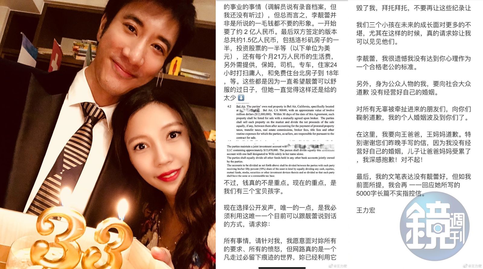 另外,王力宏也對李靚蕾喊話,「我很遺憾我沒有達到你心理作為一個合格老公的標準」、「現在選擇公開發聲,唯一的一點,是我必須利用這唯一一個目前可以跟靚蕾說到話的方式」。