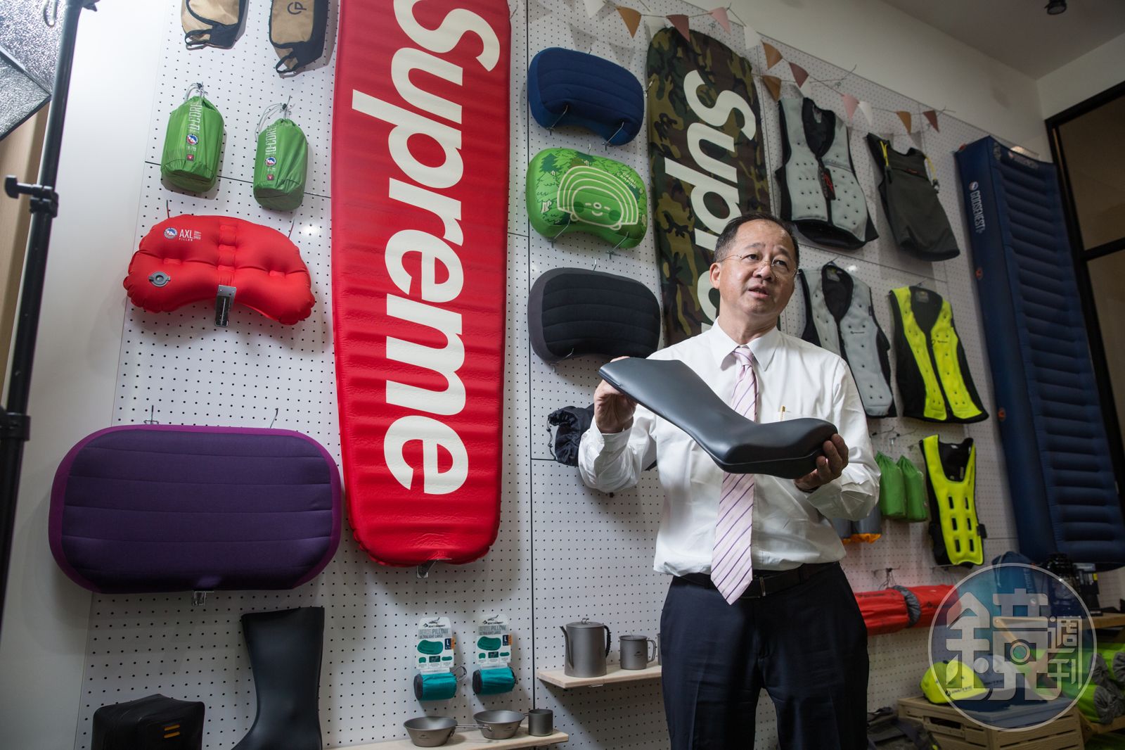 他常上秒接到客戶電話,下秒趕搭飛機到客戶所在地,辦公室隨時放一卡他戲稱玲瓏袋的行李箱,裝滿八貫各式產品,他拿起救生衣、坐墊大口吹氣,三兩下充氣成型,「人家問我做什麼,做醫療、航太、戶外,馬上展示,通常我只有5分鐘設立所有產品,客戶才進來聽,那張氣墊床,他們要求吹7次就要充起來,我肺活量很大吼。」他臉不紅氣不喘,不一會兒,4、5款商品飽滿挺立。