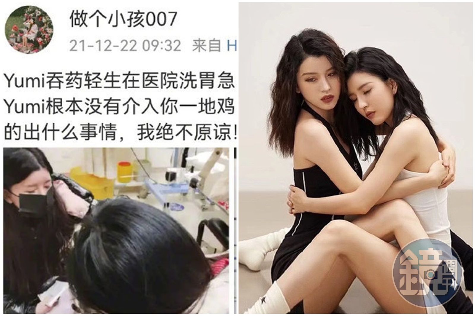 王力宏被前妻李靚蕾「核彈級」爆料混亂男女關係,以及劈腿約砲等醜聞,接連扯出他在演藝圈的複雜關係,其中By2妹妹Yumi還與李靚蕾隔空對嗆,逼得李不得拿「Yumi裸照證據」證實自己所言不假。怎料,今有中國網友爆Yumi吞藥輕生,微博帳號名「做個小孩007」今早上9點曝光數張Yumi在醫院急救的照片,掛號單也寫著「經診斷藥物中毒」,甚至還標註王力宏:「你最清楚Yumi根本沒有介入你一地雞毛的婚姻!!!如果她真的出什麽事情,我絕不原諒!!!!」
