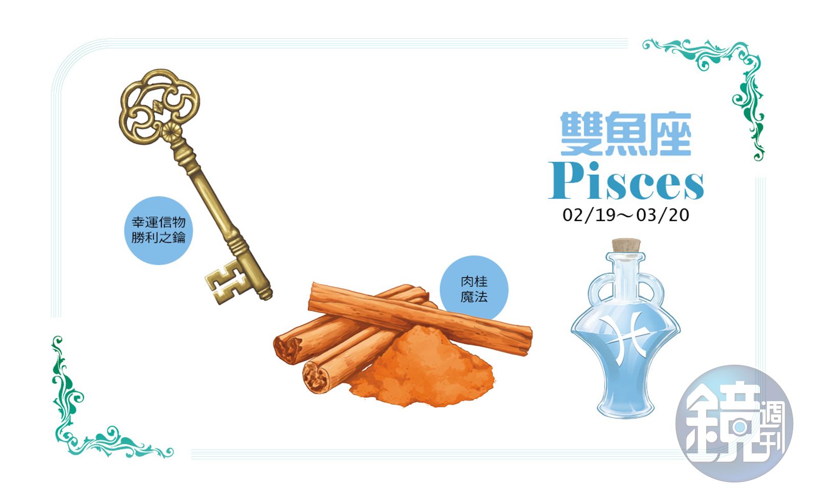 雙魚作為年度之星,全速衝刺前得趁勢引進生命陽光,照亮塵封死角,肉桂堪稱首選。屬性為火的肉桂是女神維納斯的靈性象徵,用途廣泛、具備魔法百搭功能。是成功、力量與欲望的催化劑,常用在淨化、療癒、護身、戀情、戰鬥、招財與旺運。肉桂薰香、香精或肉桂調味的飲品烘焙料理,有助創業或奮鬥者馬到成功。