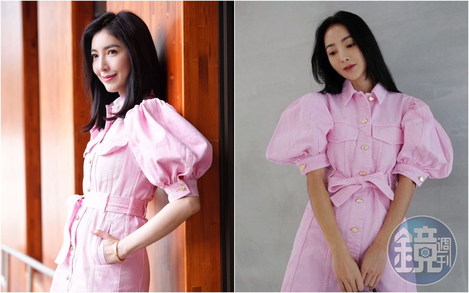 (左起)楊謹華、吳速玲各自以不同的氣質詮釋同一件Aje粉紅色氣球袖排釦牛仔短洋裝,NT$12,800。(合成照片)發布時間:2021.12.25 18:42 臺北時間