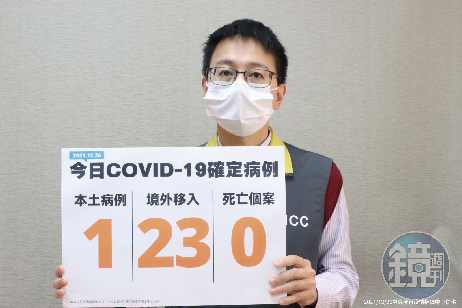 今日新增1例本土病例(案17026),為30多歲本國籍男性,未接種過COVID-19疫苗,2021年12月25日因有陪病需求至醫院採檢,於今日確診(Ct值34.1,二採PCR檢驗陰性),血清檢驗IgM陰性,IgG陽性,研判為非近期感染,研判為舊案。目前已匡列接觸者14人,3人列居家隔離,6人列自主健康管理,5人列自我健康監測,其餘接觸者匡列中。衛生單位刻正進行疫情調查及防治工作,以釐清感染源。