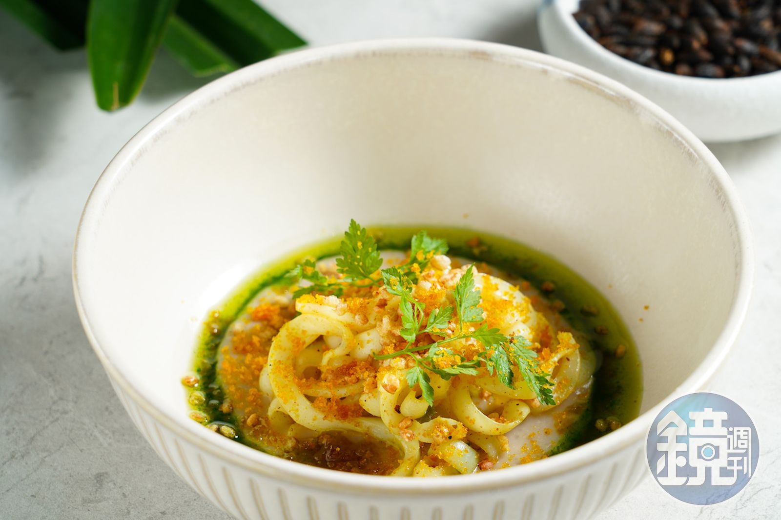 「細切小捲 那瑪夏小芋頭 大武山小米 雲林白蘆筍」以綿綿芋泥佐鮮鹹海味。(2,400元套餐菜色)發布時間:2022.01.02 08:57 臺北時間