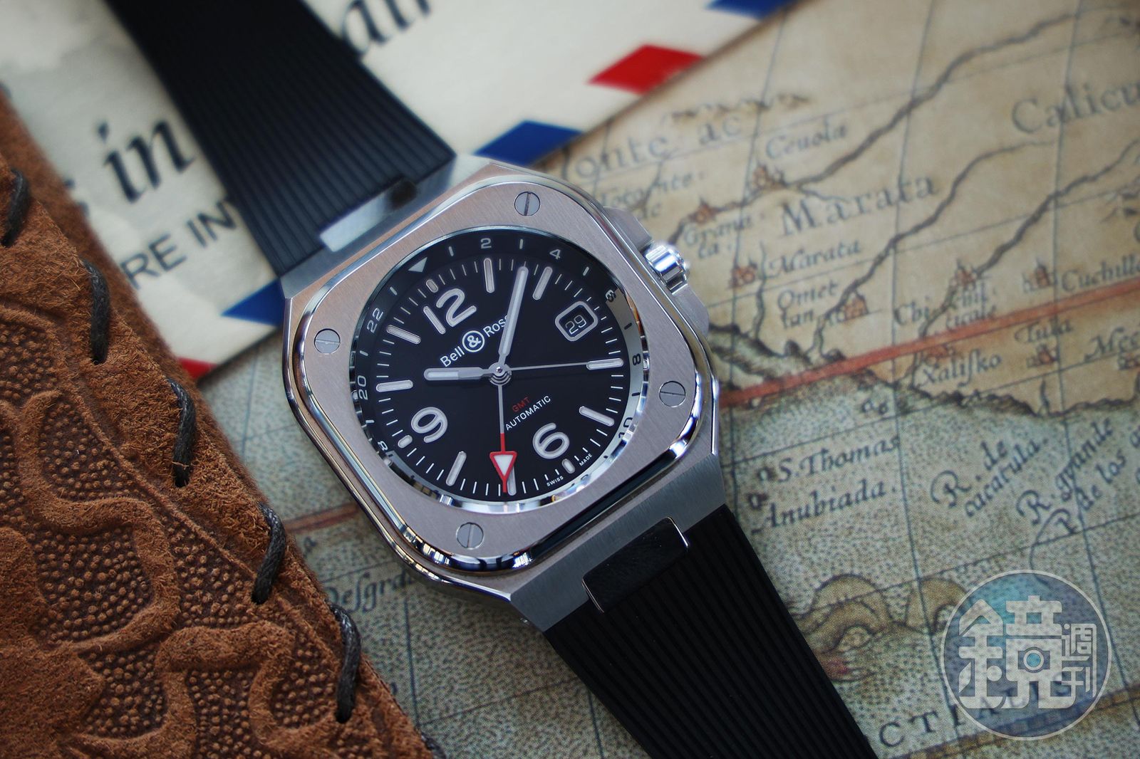 同時為了不讓外型看起來複雜,BR 05系列的GMT表現形式,是在面盤外緣的內錶圈做了一道立體切面,以灰、黑兩色將24小時指示圈劃成兩個半圓,第一眼你會覺得它仍是一支簡潔的三針款。正因為BR 05方殼包覆圓盤的設計,面盤會有內縮的感覺,此舉讓GMT加入的同時,外型仍保有俐落颯爽的樣式。當然它的GMT功能還是很有辨識度,在此BELL & ROSS用上一根尖頭紅針來指示,閱讀性還是相當好的。