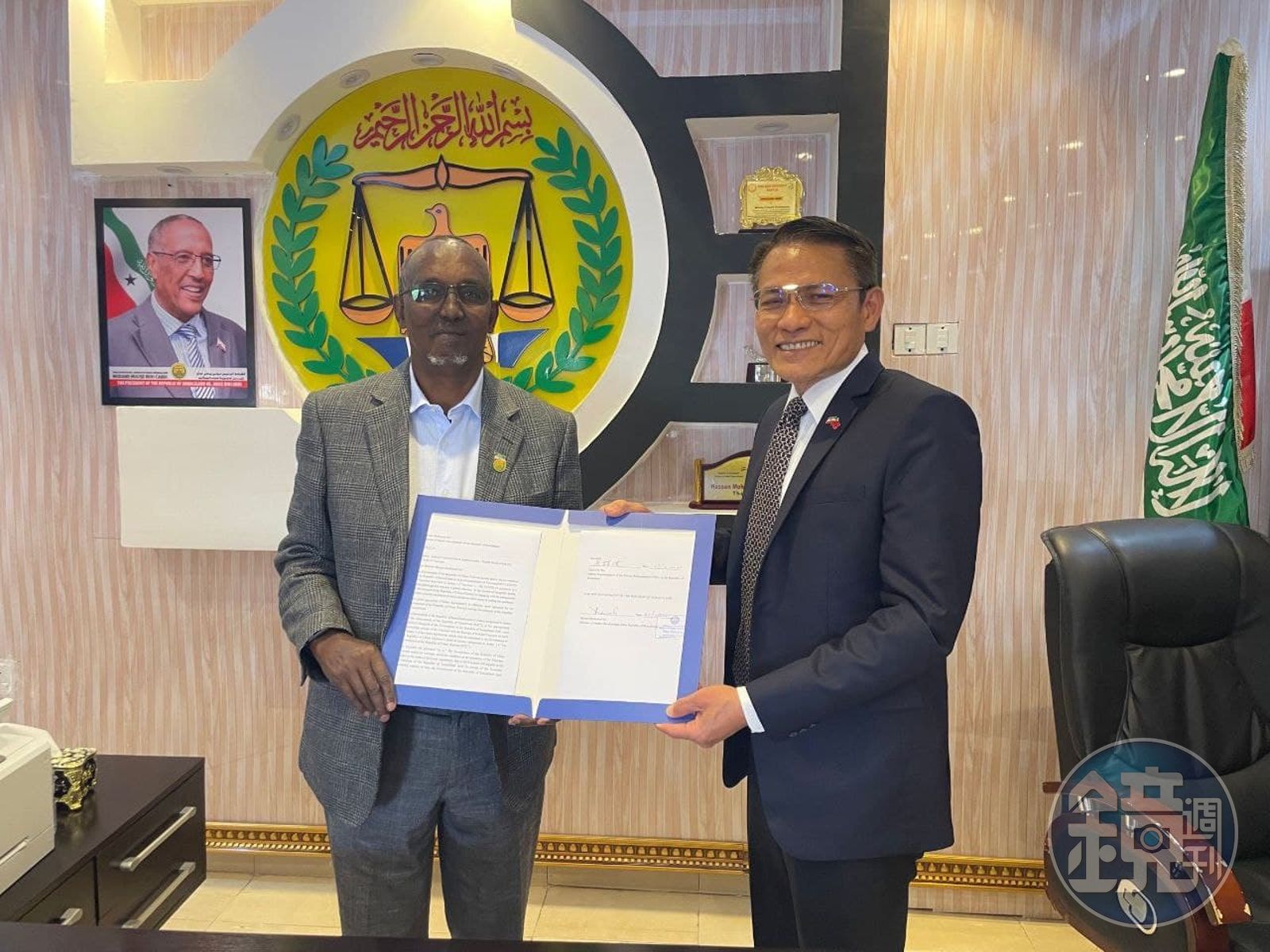 我國駐索馬利蘭代表處臨時代辦吳鎮祺(右)於12月27日與索國衛生部長完成簽署我國援贈索國疫苗協議。(外交部提供)發布時間:2021.12.28 10:59 臺北時間