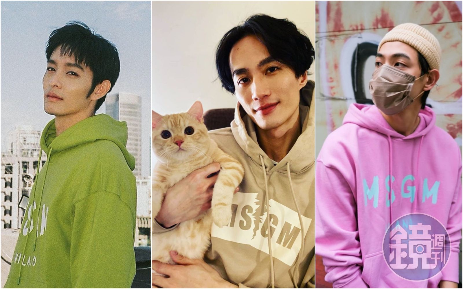 MSGM Logo系列服飾簡單好搭,每一季都會推出季節新色,更是潮人、藝人經常穿上成為街拍首選的單品。曹佑寧的草寫Logo帽T搭配季節色草綠色,格外搶眼;連晨翔身上的粉紅色草寫Logo帽T則是近期男裝最夯的粉色系;李英宏以今年最夯的奶茶色上身,讓撕裂Logo效果帶來的陽剛味多了一分柔和感。