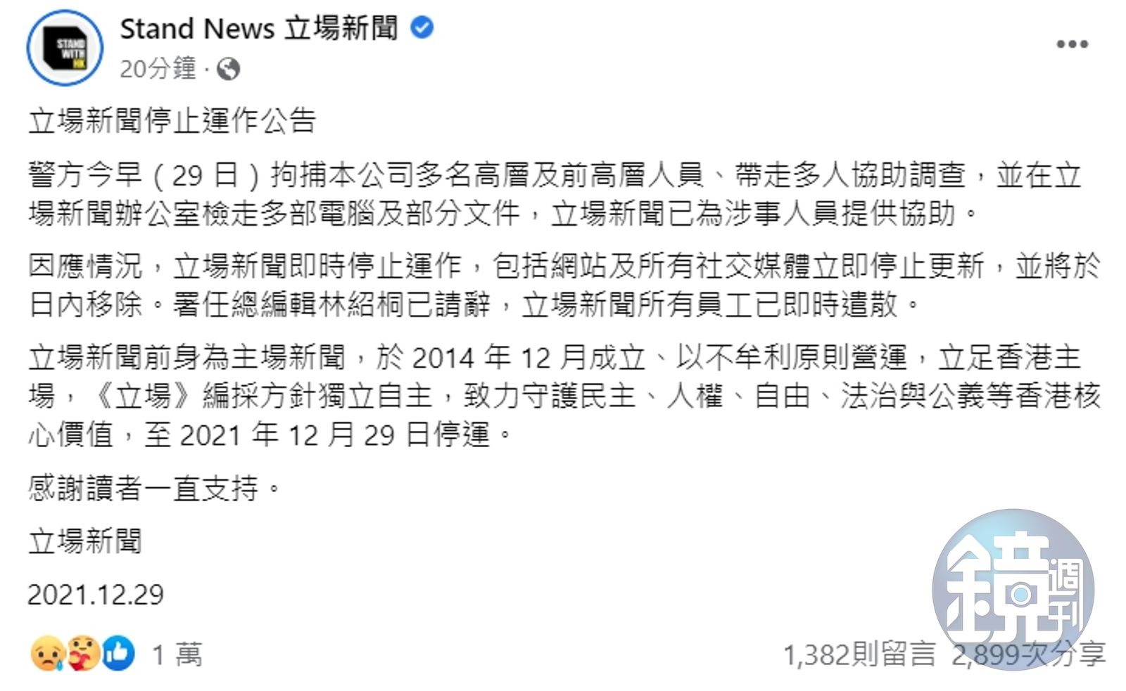 《立場新聞》前身為《主場新聞》,於2014年12月成立、以不牟利原則營運,立足香港主場,《立場》編採方針獨立自主,「致力守護民主、人權、自由、法治與公義等香港核心價值。」無奈在北京逐步收緊香港控制權的現在,終究走到這一步,在2021年12月29日停運,「感謝讀者一直支持」。