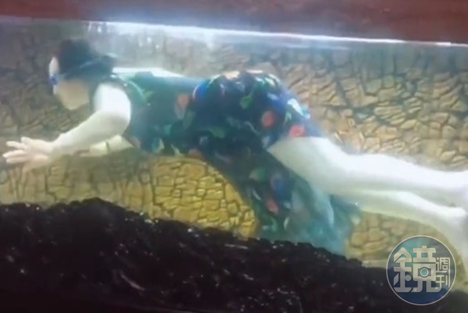 女網友表示,家裡魚缸長度超過4公尺,占據了一整面牆,強調魚缸有定期消毒,裡面很乾淨,彷彿母親已經不是第一次把家中魚缸當成游泳池潛水了。