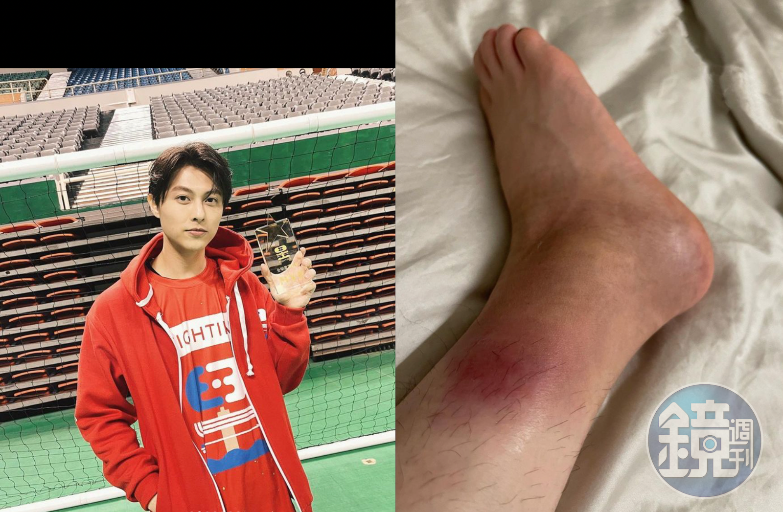 《全明星運動會》進行到第3季,以前是運動員的王子(邱勝翊)表現優秀,一開季就連拿2座MVP。王子運動強,也很會管理時間,近期傳出與郭雪芙熱戀中。昨(29)日他貼出自己右腳腳踝腫大紅紫的受傷照,照片頗為嚇人,原來是他在練習時受傷,而一向貼心優雅的王子怪的是自己,「在練習受傷當下,心想完了,還有那麼多比賽怎辦?這種無法替團隊貢獻的感覺太難受了…」
