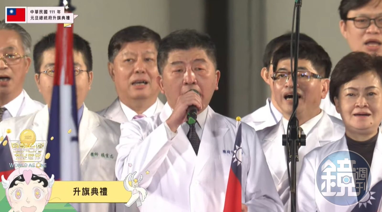 2022年總統府元旦升旗典禮,特別邀請守護國人健康的醫護人員領唱國歌。 中華民國111年元旦總統府升旗典禮,以「堅韌台灣,立足世界 World as One」為企劃主軸,由於這2年受COVID-19疫情影響,並於去年5月爆發本土疫情,除了邀請陳時中及醫護代表擔當國歌領唱人以外,也安排一群熱血的急診醫師組成的搖滾樂團「重症搖滾」表演自創曲,藉此感謝醫護人員過去2年對抗疫情與守護台灣。