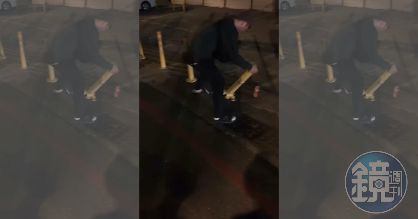 影片中多名男子深夜疑似酒後在街上嬉鬧,先把一旁商家的「禁止停車」拒馬往道路拋擲,接著扯下路邊公有停車場的回復桿,先是繞著桿子不斷轉圈,之後再用力將桿子砸到一旁,男子的朋友不僅未上前阻止,還拍下脫序影片,事後還將影片上傳到IG,把男子破壞公物的離譜行徑當成一件有趣的事在分享。