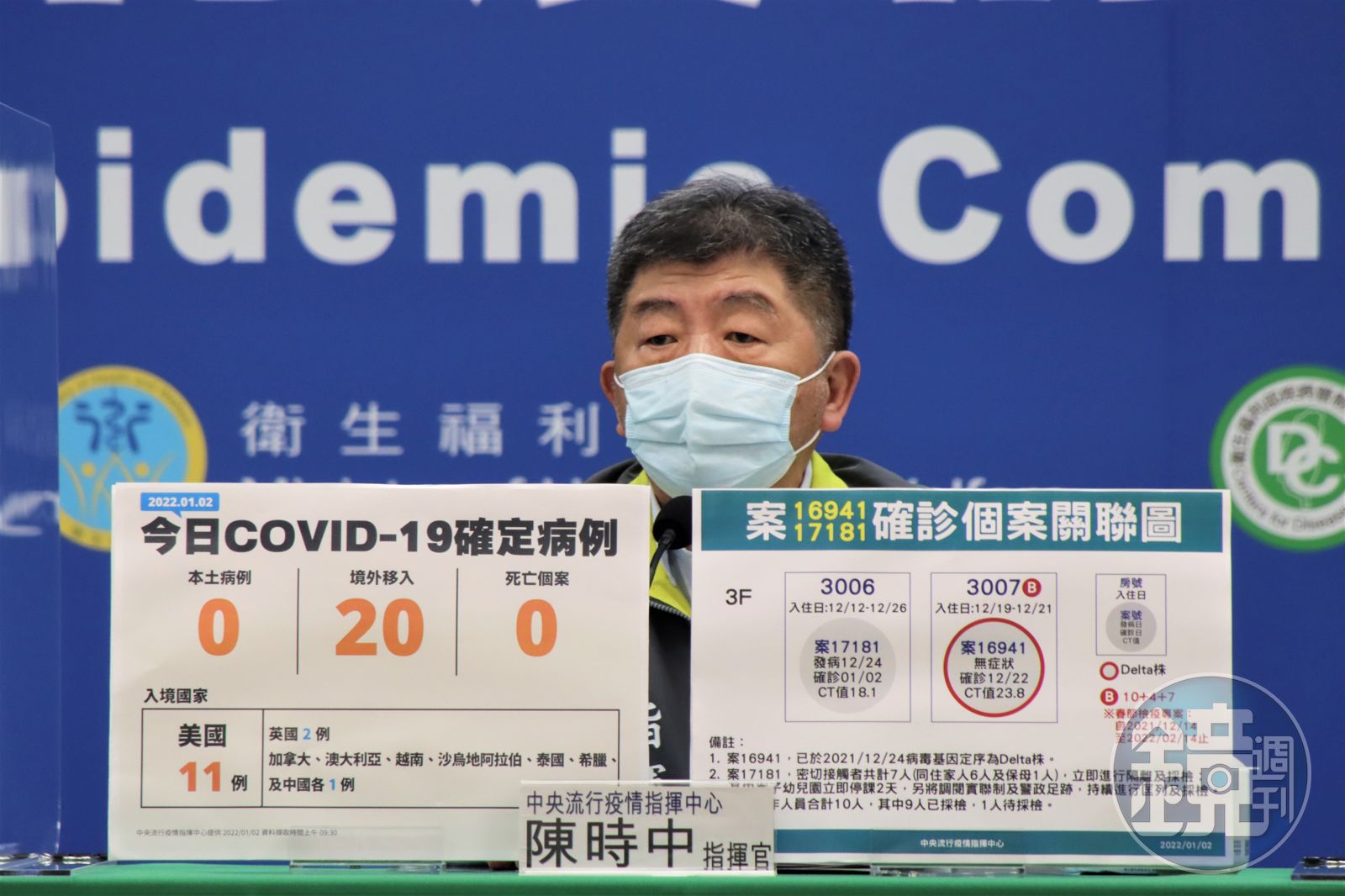 指揮中心表示,今日新增20例境外移入個案,為10例男性、10例女性,年齡介於未滿5歲至60多歲,分別自美國(11例,案17162-17163、17165-17166、案17168、案17170、案17172、案17174-17175、案17179-17180)、加拿大(案17164)、澳大利亞(案17167)、英國(2例,案17169、案17177)、越南(案17171)、沙烏地阿拉伯(案17173)、泰國(案17176)、希臘(案17178)及中國(案17181),入境日介於去(2021)年12月12日至12月31日。