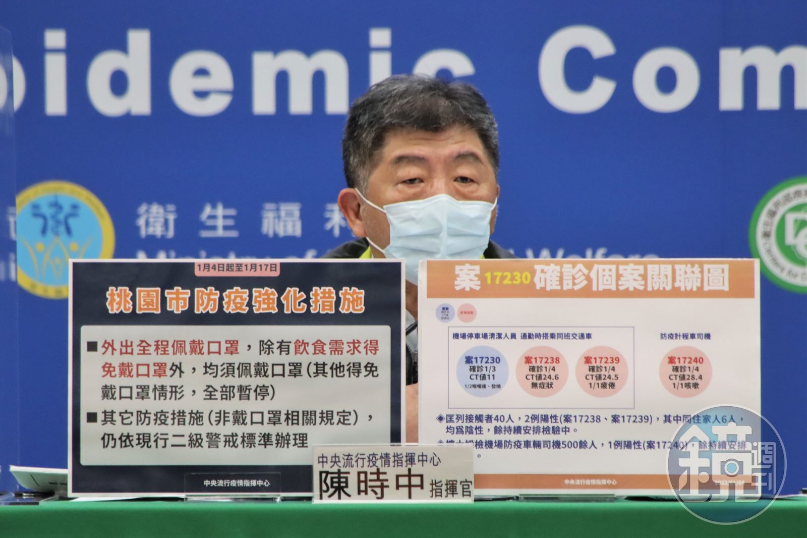 陳時中補充提到,案17230為本國籍40多歲女性,目前研判應為Omicron傳染個案,而且該案12月30、31日上午9點到12點曾在忠貞市場擺攤,為因應該案確診,將在附近設置3處社區採檢站。陳時中也提醒桃園市民,從現在開始至1月17日前,桃園市應採取防疫強化措施,「外出全程配戴口罩,除有飲食需求得免戴口罩外,均須佩帶口罩」;機場也將採取強化防疫措施,「防疫計程車司機每3天深喉唾液PCR採檢1次、機場內工作人員每周快篩採檢1次,有症狀者立即進行深喉唾液/鼻咽PCR採檢」。