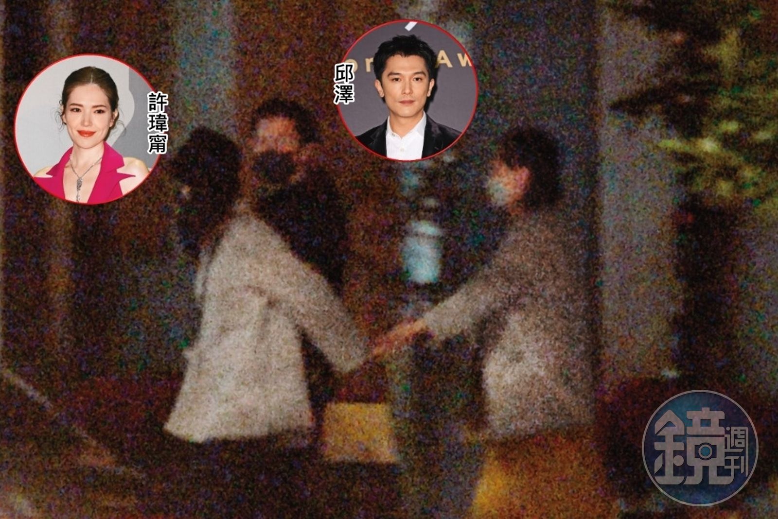 2021年12月23日,本刊接獲線報,許瑋甯、邱澤正在台北市大直的餐廳聚餐,裝扮低調的2人剛結束餐敘,緩緩地步出餐廳在門口等車。穿著米灰色外套的許瑋甯似乎有些疲累,先行一步上了白色賓士保母車等待,而邱澤看來心情愉悅,忙著和門口的友人們寒暄、擁抱一陣,隨後才跟著上車。