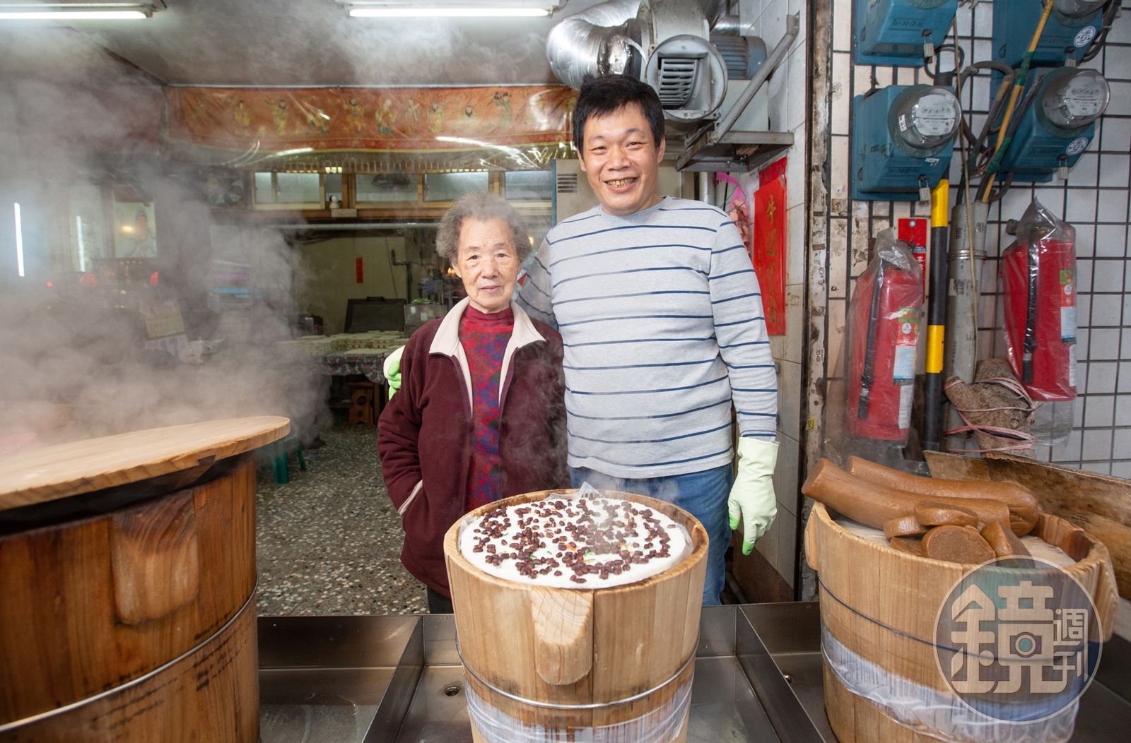 從小在米堆裡長大,周國良11歲就開始幫忙製作年糕,聊起米食滔滔不絕。「米是活的東西,擺一段時間煮來吃就不一樣。裡面的水分隨時間流失,味道就不同。我們用新、舊蓬萊米混合,新米香甜、舊米就是陳年的味道。」製作過程從洗米就有眉角,溫度高,米容易酸,「夏天水溫度也高,就要先把米冰起來,水沖下去溫度就會剛好。」但溫度也會影響米的吸水能力,溫度低,吸水能力差,「夏天泡一小時,冬天泡四小時,遇到寒流就更久,冬天是旺季,但花的時間更長,就要更早起。」