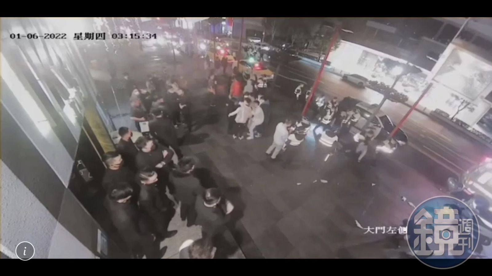 十餘名男子在店外打成一片,夜店報警後也派人在門口安管。(警方提供)警方指出,涉嫌鬥毆的白姓(25歲)、鄒姓(24歲)等10人,都是年約20餘歲的年輕男子,其中白男疑有竹聯幫背景,昨晨白男等10人在該夜店飲酒作樂,懷疑隔壁包廂的曾姓(20歲)男子等3人出言挑釁,雙方一言不合,大打出手。