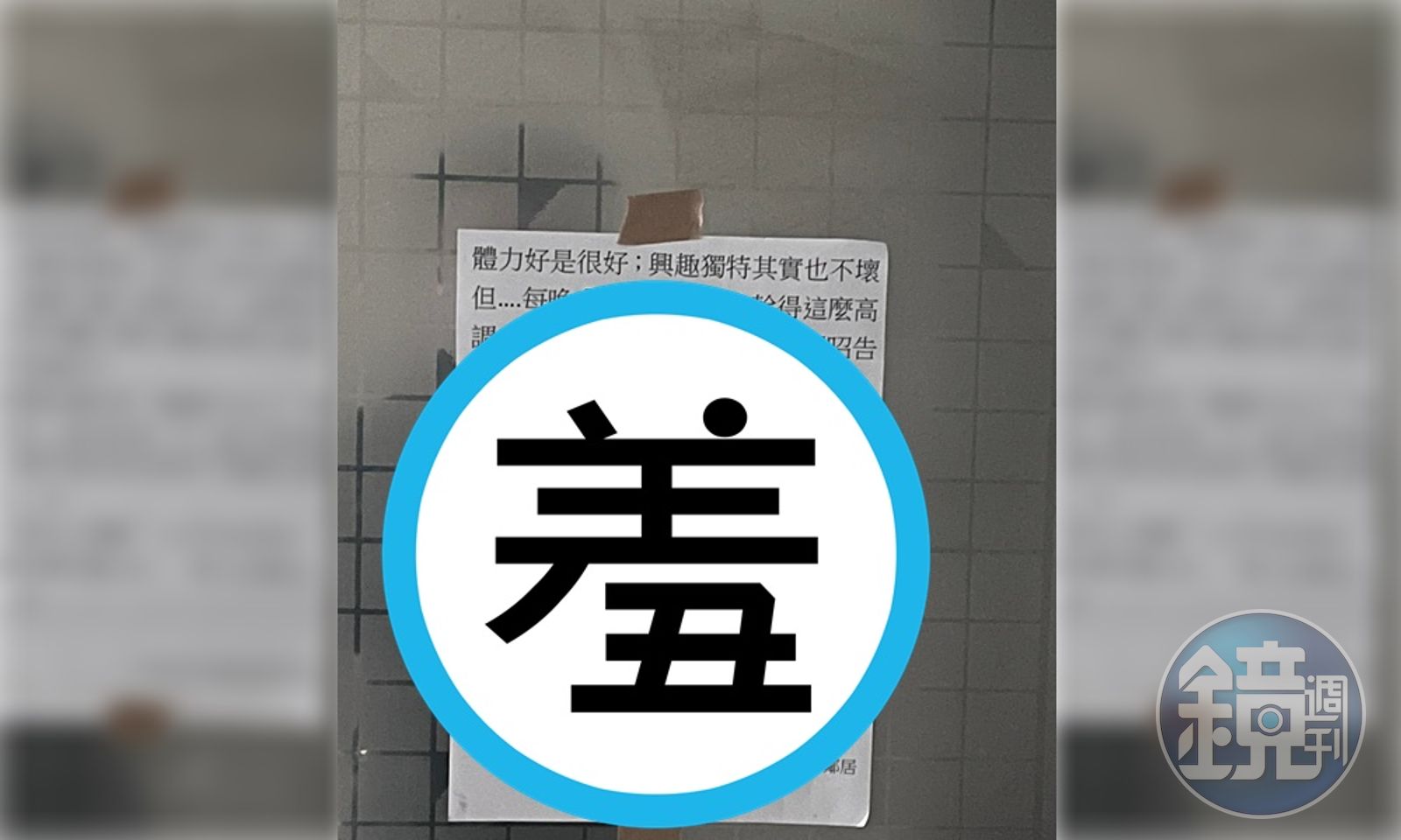 該住戶在紙條上寫著,「體力好是很好,興趣獨特其實也不壞,但……每晚『X』人家老木X得這麼高調,這麼大聲又這麼多次,是想昭告天下你的體力很好?還是告訴大家你有特殊癖好?」甚至還建議對方若要高調,可以上「華根初上」挑戰FBI,接著狠酸對方:「說不定還能成為另類的台灣之光,還有個良心建議,太多次的話當心鐵杵磨成繡花針、擎天柱變成小GG」,最後署名寫下「老是被你做愛聲吵醒的鄰居」。