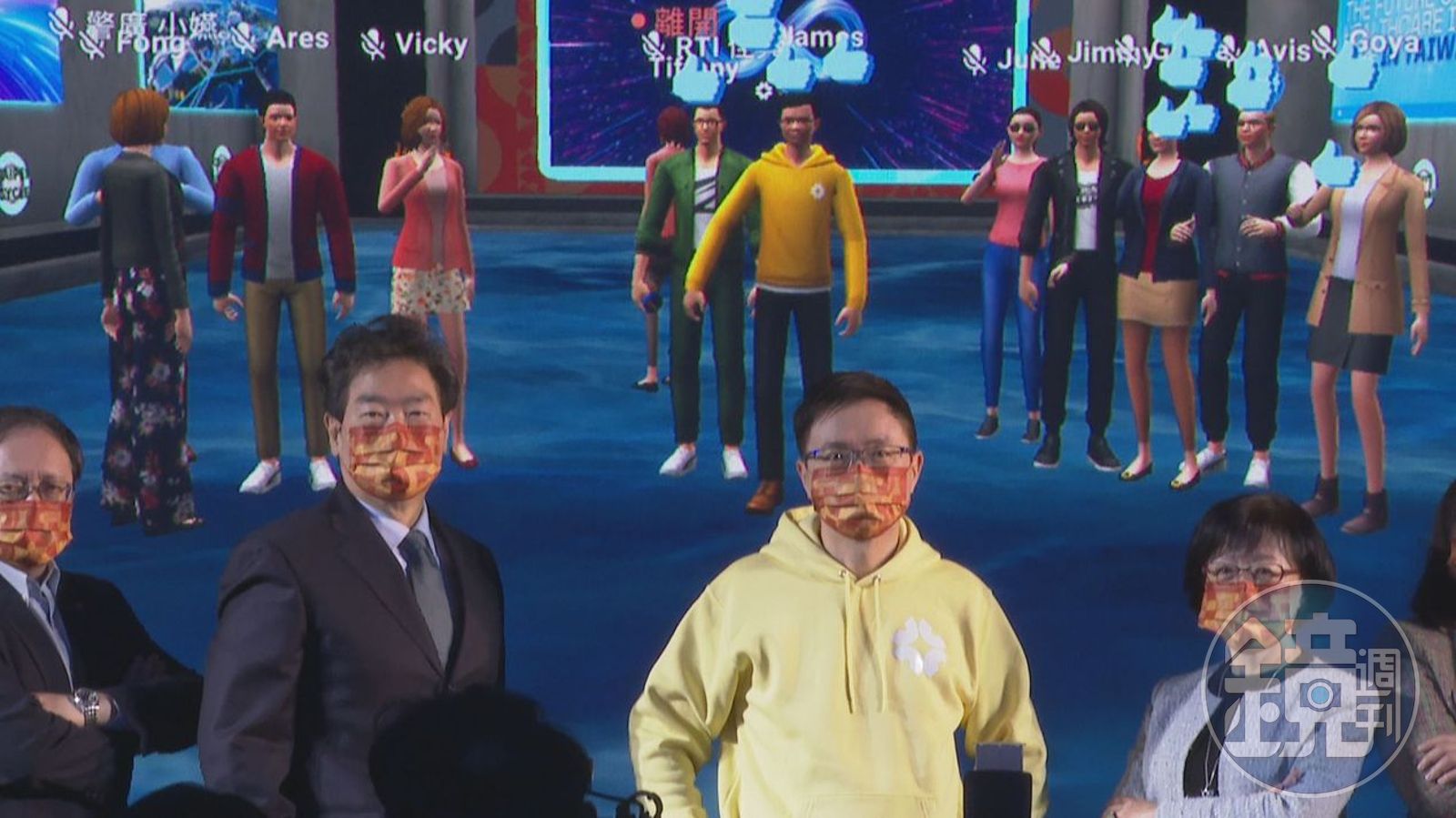 外貿協會董事長黃志芳化為虛擬人物,跟與會貴賓的分身一起拉禮砲,大秀元宇宙科技。黃志芳:「各位每天的生活當中,一定會看到或聽到3個字,那3個字叫做元宇宙,因為實在太夯了,我聽說南部的老人家都在問元宇宙是什麼。」