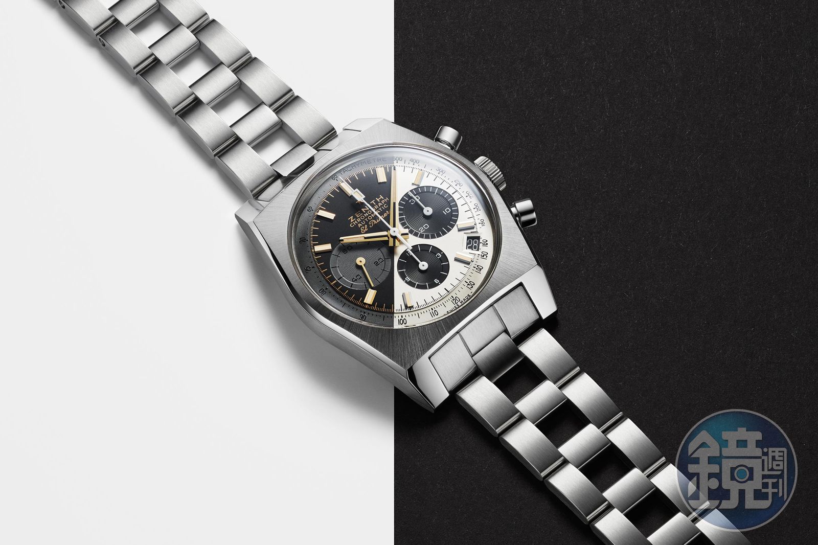 歷經前兩次充滿話題的合作之後,ZENITH這款第三代的最終版,直接擷取前兩版的面盤配色,合而為一,打造出不對稱的雙色面盤。為了閃過小錶盤,被切齊的兩半並非是從整點開始分割,而在製作上首先要將錶盤坯件右側完全塗成銀白色,隨後再切磨打造出黑色計時盤,而另㇐半錶盤則需事先覆以㇐層透明無色的漆面作為保護。將另㇐半錶盤塗成黑色時,則要為原來的白色部分覆以保護層。保護措施若稍有不慎,就會導致顏色相互滲透,錶盤也因此報廢。