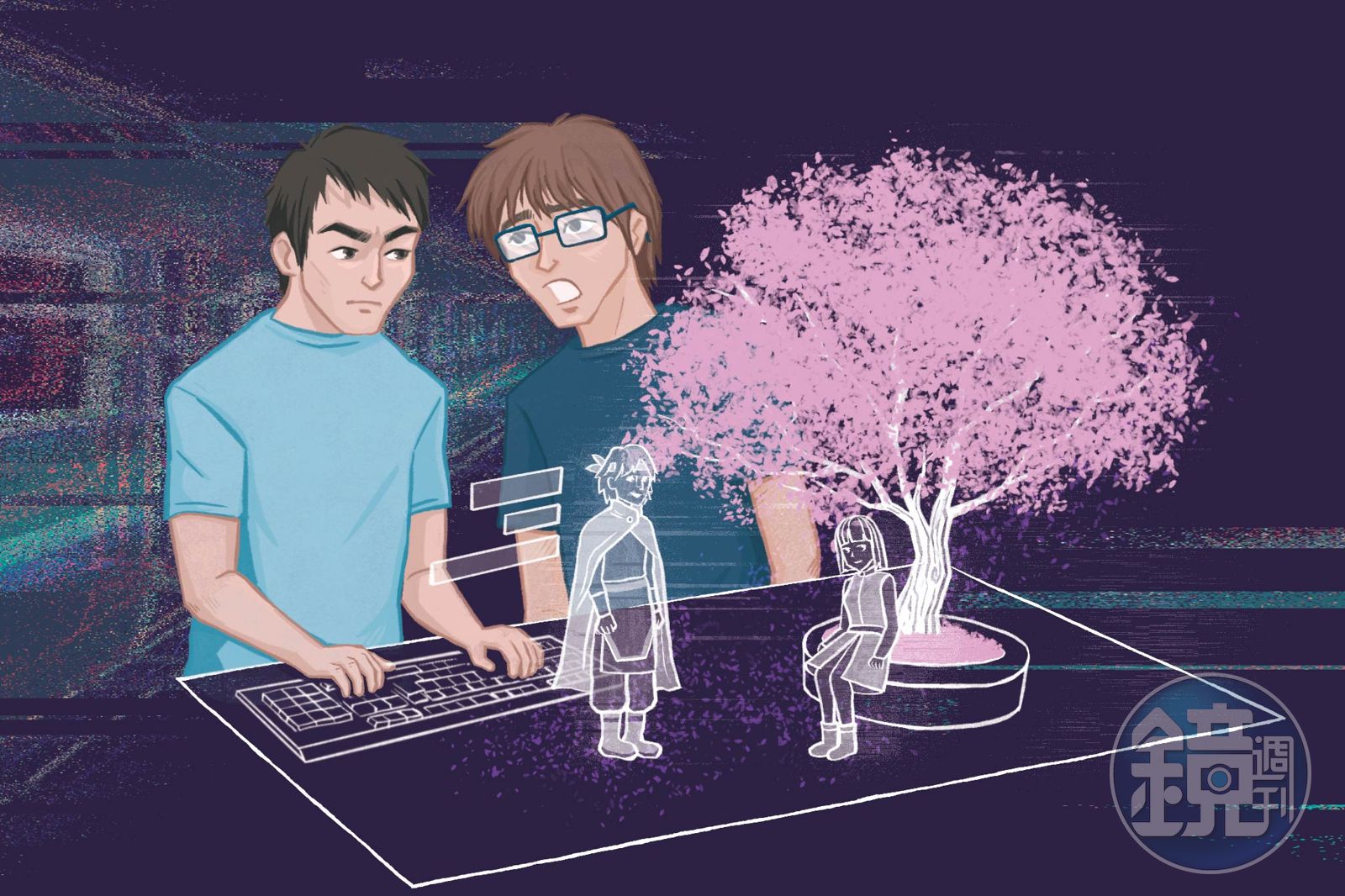 他的角色佇立在圖書館門口,陳信瀚開啟公會頁面,夕梨的人物在線上。陳信瀚使用回城券,移動到公會駐點。夕梨在櫻花樹下坐著,花瓣紛飛,她的角色一動也不動。