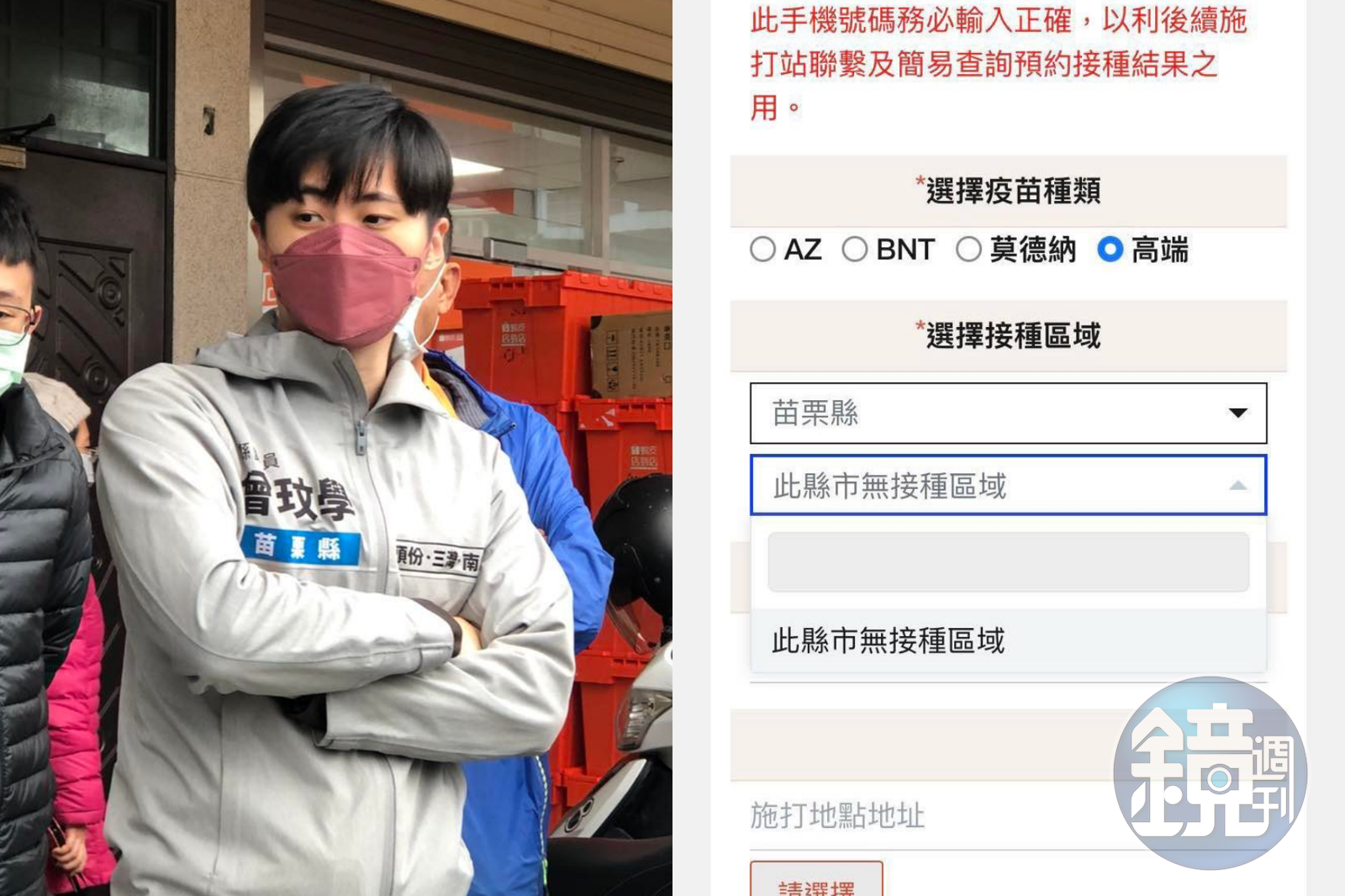 不過苗栗縣議員曾玟學昨日在網路上揭露,不少朋友想選擇高端疫苗作為第三劑加強劑,1922平台重啟後其他很多地區都是馬上就被搶完,但苗栗縣卻顯示「此縣市無接種區域」,讓人疑惑「苗栗縣連開放都沒有開?難道苗栗沒有高端可以打嗎?」