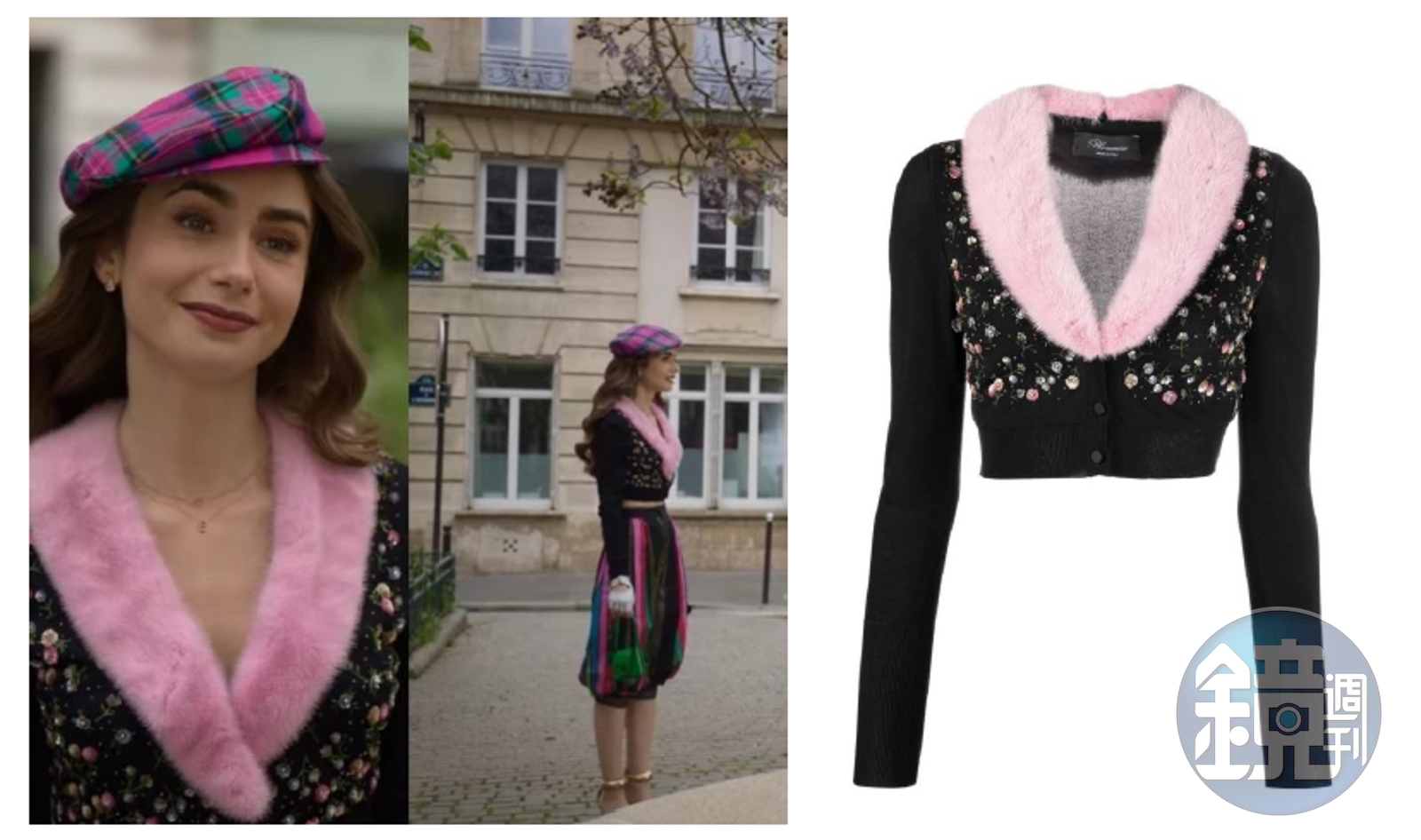 Lily Collins以一身黑色為主色,搭配粉、紅、綠色系單品讓視覺看來繽紛有趣,上半身帶有毛茸茸的衣領針織衫一直是BLUMARINE的經典單品,她領口柔軟的水貂毛讓低溫多了保暖度,滿布的鑽飾則為黑色面料增加立體感,短版剪裁凸顯腰身,讓她優雅又可愛。