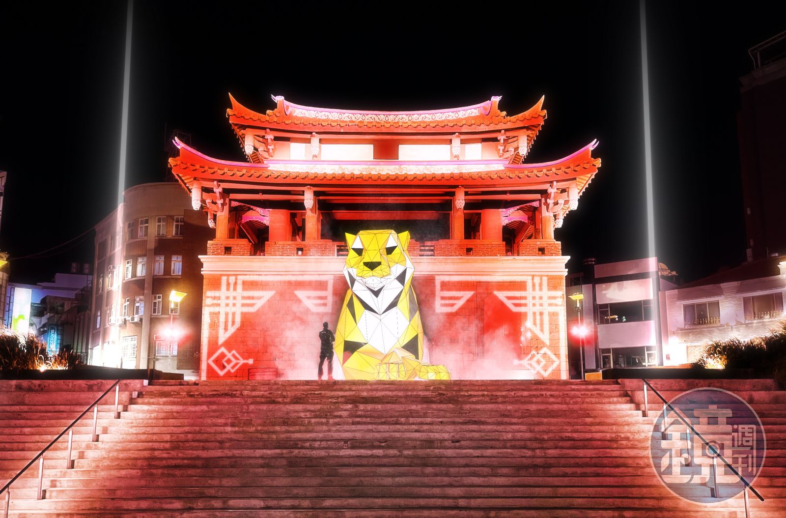 主燈作品《虎爺》盤距在市中心的東門,正似伏坐在神案下的「虎爺」,神氣地鎮守竹塹城,保佑四方,黑夜特別搭配的聲光展演,彷彿吼出新年新希望;而「都市藝術工作室」與聲音藝術家林弘韜合作的作品《掌聲林》,引導民眾走入充滿虎嘯與風聲的森林,地上的虎掌腳印呼應周邊環境音,忽明忽滅。