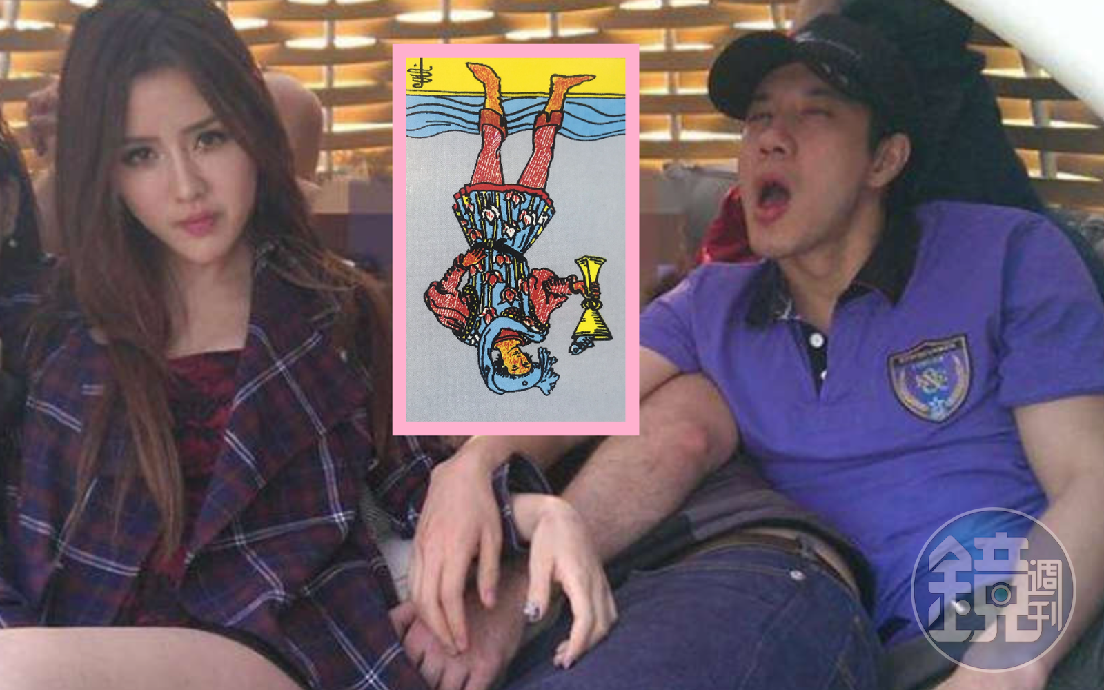 「她想要捉住王力宏這條魚,但是都捉不住。」仔細看「聖杯侍者」這張塔羅牌,侍者手持聖杯,聖杯中有一條魚,但牌卻是倒的,「聖杯侍者『逆位』倒過來,女的捉不著杯中的魚,套不住的。」