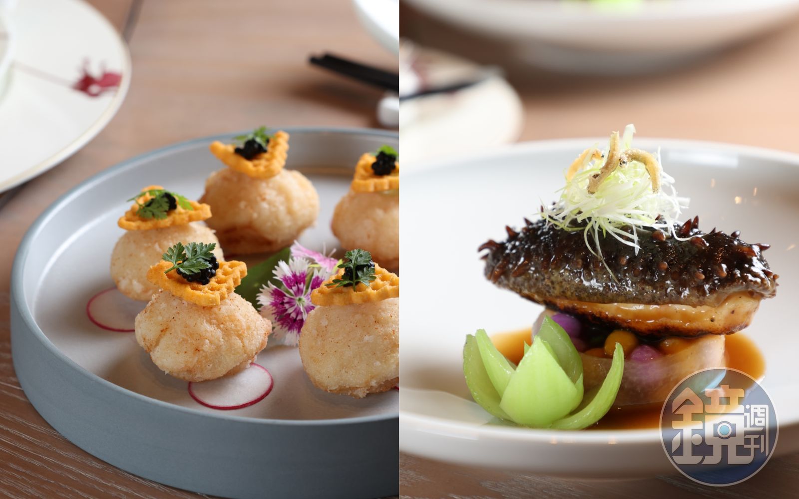 同樣以黃湯烹煮的「水晶大蝦球」,冬瓜托起花形蝦球,入口軟滑、彈脆交融,點上魚子醬與金箔,貴氣雍容。「魚子龍帶玉梨香」小巧有如finger food,把蝦漿與北海道干貝、梨山水梨包成球,裹薄粉酥炸,鮮美中竄出熟悉隱味,「南部人吃海鮮、生魚片喜歡蘸芥末,如果把它點在盤底,拿起來就髒了,刻意點在餅乾下,品嘗之後才會發現。」連結在地的巧思,也設計入菜。