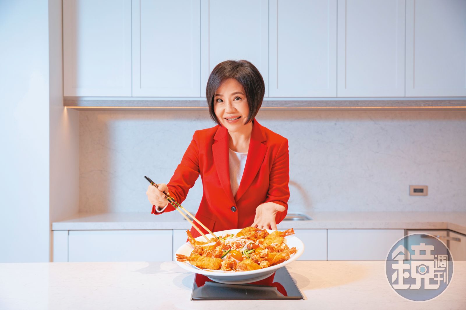 新春過年,人們在廚房裡忙著烹煮的不只是料理,更是一種味蕾與內心都忘不了的家鄉味。于美人正是如此念舊的人,為了分享這道年菜「龍鳳呈祥」,一早就去傳統市場採買,她說:「大明蝦代表著『龍』,炸雞球代表『鳳』,大明蝦排、雞球這些炸物,孩子們都喜歡,而金色在視覺上也很有朝氣感,明蝦、雞肉、小黃瓜絲、生菜絲等葷素搭配,適合全家人享用。」