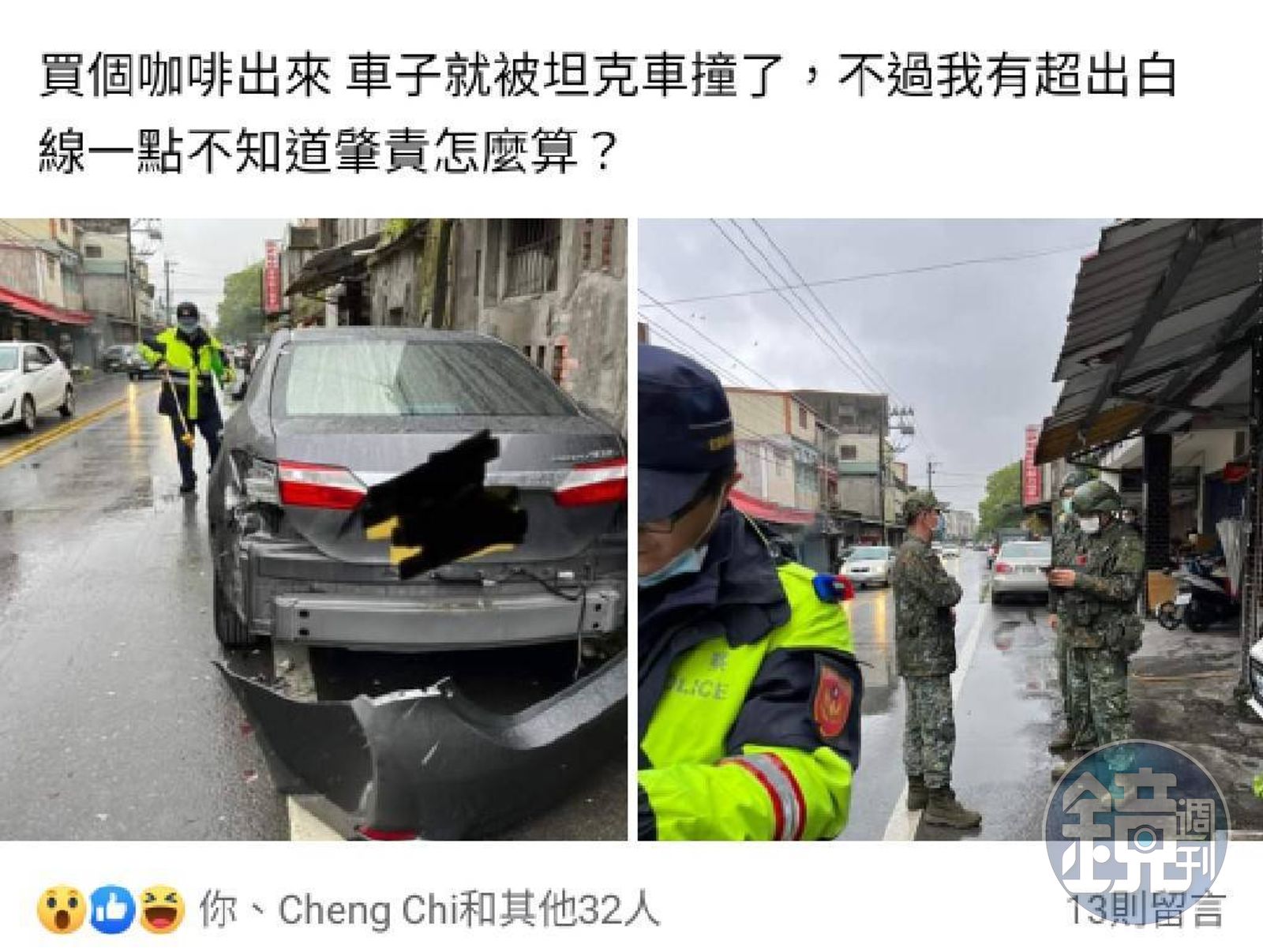 本刊取得民眾拍攝的事發影片和照片,只見坦克從轎車左方倒車,前方還有國軍人員指揮,但不久後就緊急煞車,疑似已撞上該車,對車子的後保桿和尾燈均有破損,警方到場後,對雙方進行酒測和訊問。 受害車主在其臉書指出,他只是去買個咖啡,沒想到出來車子就「被坦克撞」,也算是「人生成就達成」,感到很無奈,目前車輛已進廠大修。 據了解,闖禍的坦克隸屬於國軍蘭陽指揮部,究竟詳細事發經過為何,仍待警方和軍方進一步說明。