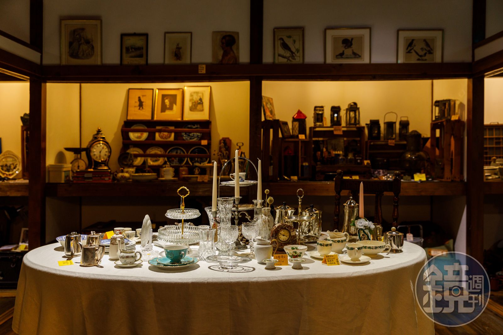 老闆喜歡收藏歐洲老飯店流出的古董餐具。商品會附上小字卡介紹年代及價錢,全都是獨一無二的存在。1918年德國製的瑞士軍用蔡司照明燈,要價不菲。 店內上千件古物琳瑯滿目,除了二手軍用品,還有古董瓷器、碗盆與娃娃等。「鎮店之寶」則在院子裡,是一輛經歷二戰時期的瑞士軍用運輸馬車,自1937年保存至今,從歐洲飄洋過海到了屏東,並在此找到了它的新使命。