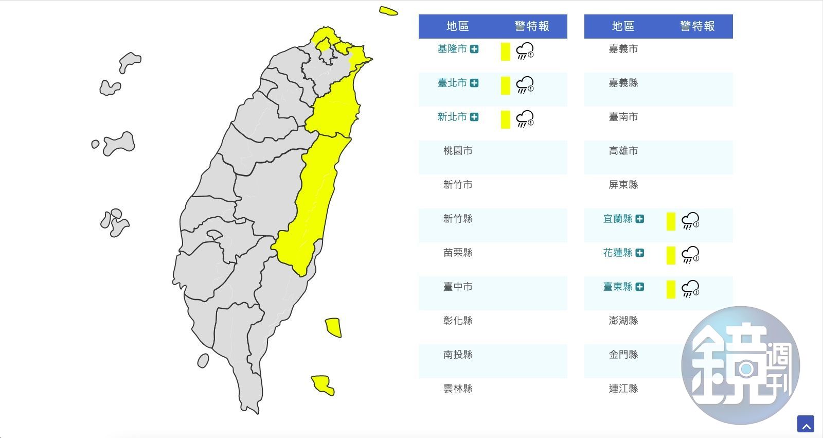 今晨(22日)氣象局對北北基宜花東6縣市發布大雨特報。氣象專家吳德榮於「三立準氣象· 老大洩天機」專欄表示,今轉東南風,氣溫稍回升,各地氣溫:北部16至21度,中部16至27度,南部17至27度,東部16至25度;中部以北及東半部有明顯降雨,南部地區的降雨也將轉大。