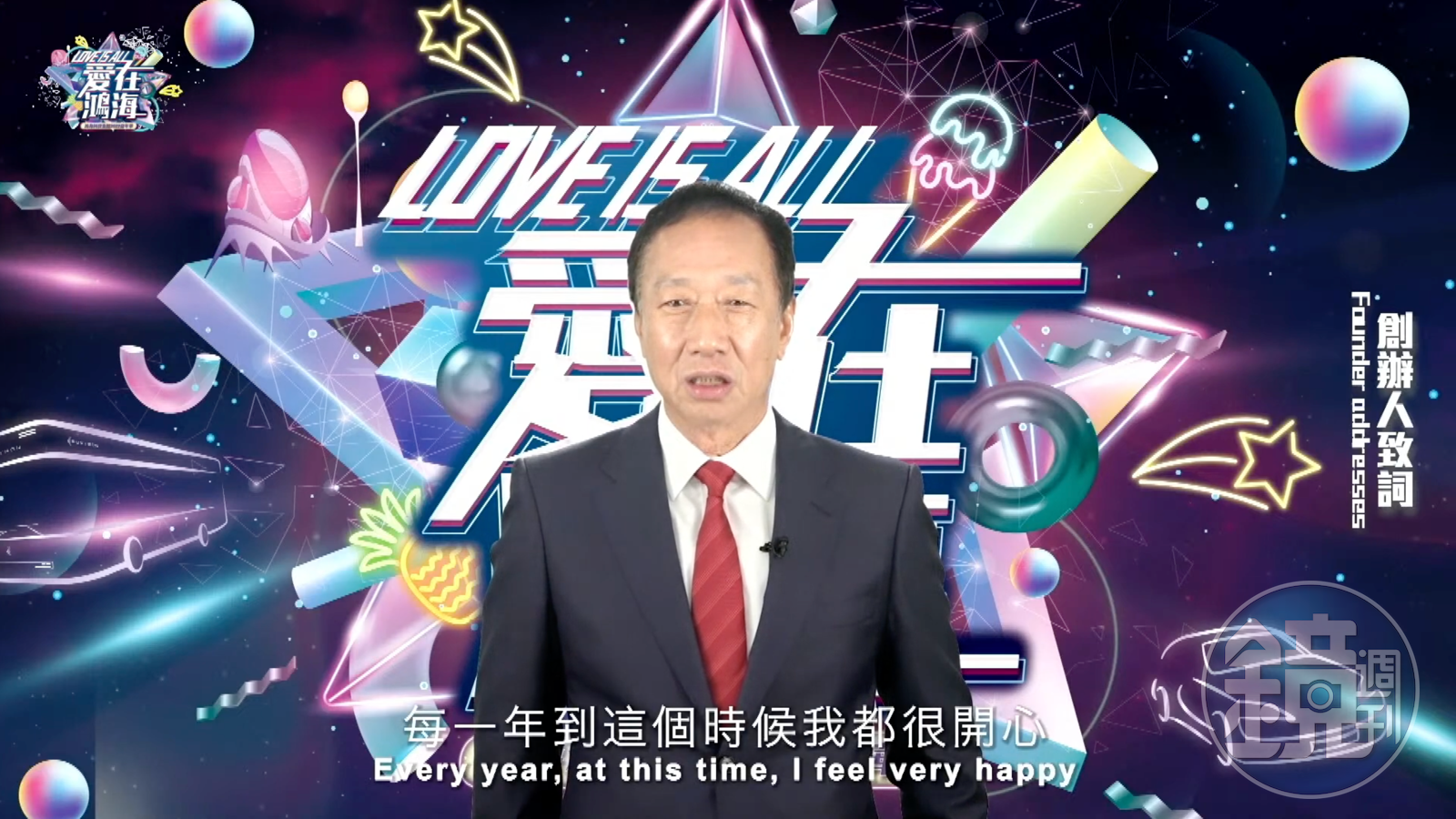 「每一年到這個時候都很開心,因為可藉由鴻海嘉年華會和大家見面,感謝集團成員一年來的辛苦,今年疫情仍然嚴峻,依然只能線上見面,期盼明年可以擺脫疫情,讓所有成員實際面對面歡聚一堂。」雖然是第2年舉辦線上嘉年華,鴻海創辦人郭台銘仍相當開心的在線上嘉年華會上,對全體同仁致意,並向董事長劉揚偉、以及0到6歲公司養的鴻海寶寶們致意。