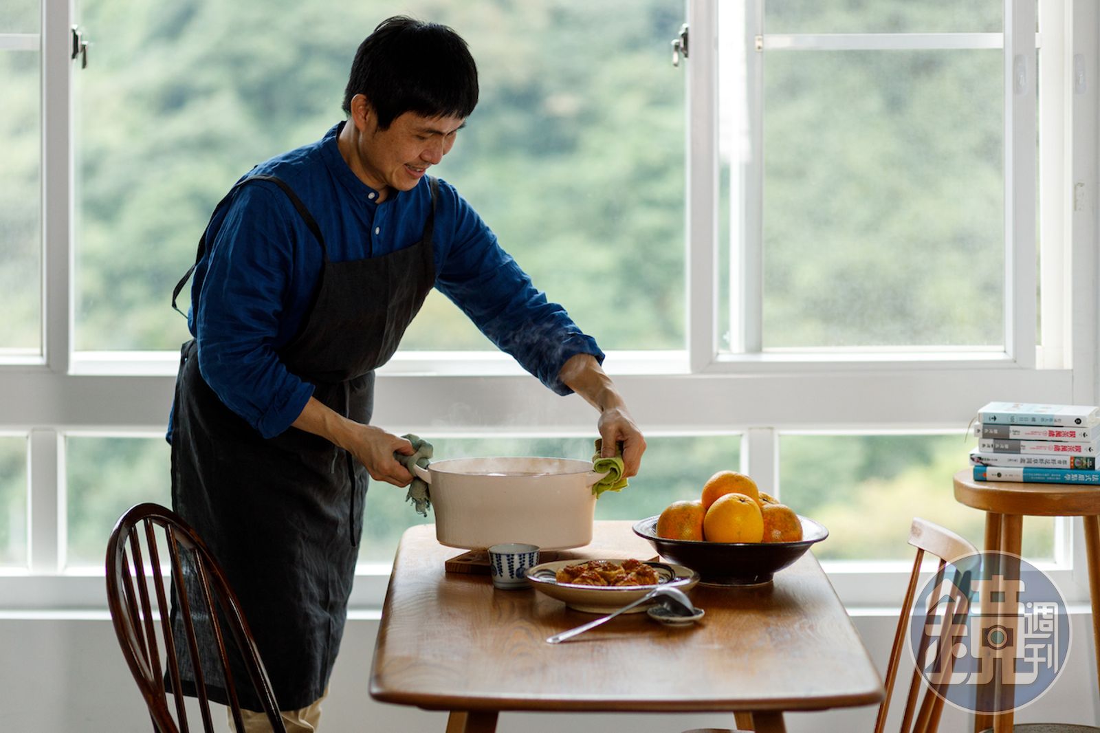 我來此吃飯飲茶,他說起老家在台東縣東河鄉,以前邱爸爸與人合夥養鹿,還種了很多橘子樹 。農場是家族重心,往來的人口也多,「家裡過節或宴客時,媽媽會端上用鐵臉盆裝著的『燉盆』,湯裡擺滿全雞、白蝦、魚丸、白煮蛋和肥厚的五花肉。」邱俊智形容:「我家都叫這鍋是山珍海味。」在鮮美豐盛的形容中,我彷彿看到家中排行最小的男孩,捱在圓桌邊眼巴巴望著比他個頭還大的一鍋湯。