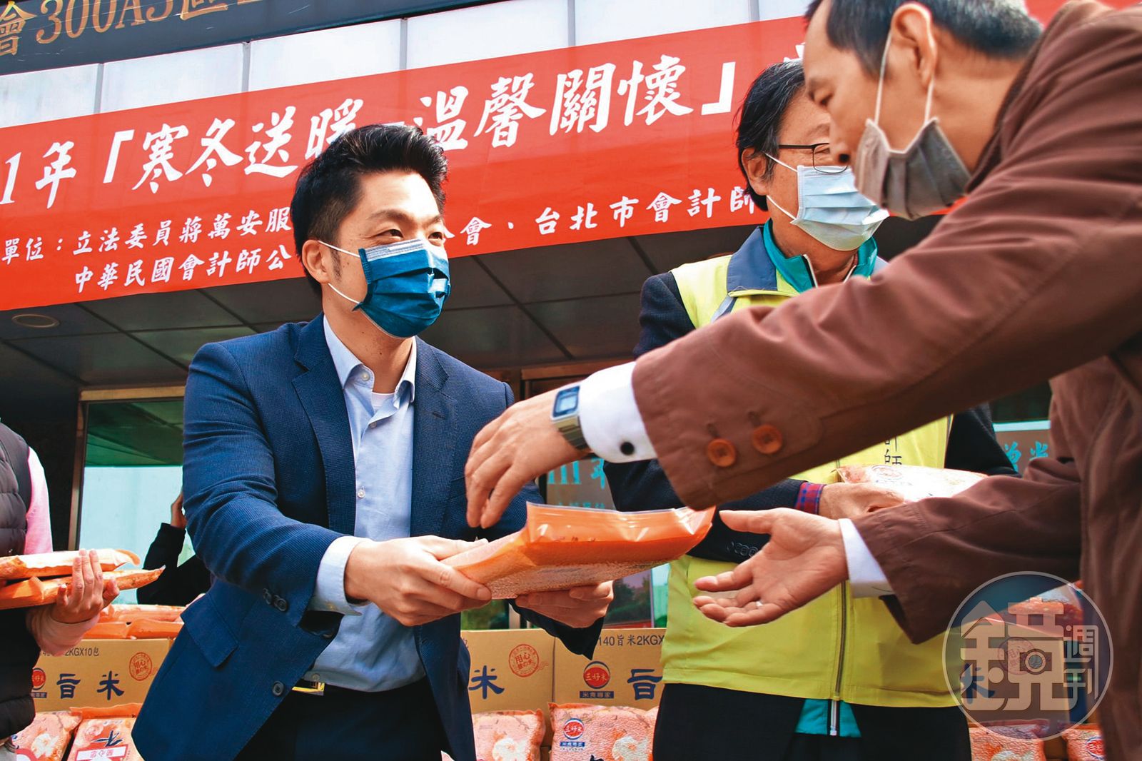 蔣萬安(左)勤跑基層,日前與會計師公會共同舉辦贈米活動,關懷弱勢。(翻攝蔣萬安臉書)發布時間:2022.01.25 05:58 臺北時間