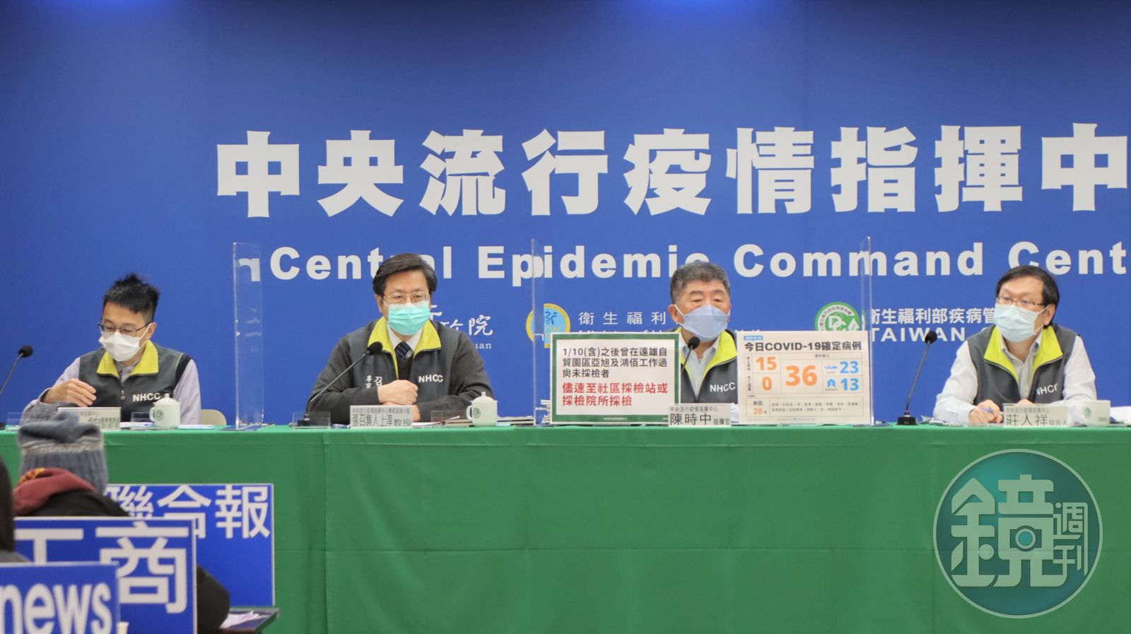 陳時中呼籲,亞旭及鴻佰尚未採檢者的人趕緊去採檢。(指揮中心提供)另外,被問及什麼時候施打追加劑?陳時中表示,自己這2天會去施打高端追加劑,妻兒則是在今天下午預約施打;而莫德納恐有缺貨情形,陳時中也透露這2天會到大約150萬劑,請民眾勿擔心;記者問及春節期間是否會召開防疫記者會?陳時中表示,這幾天會討論後公布,但除夕(1月31日)到初三(2月3日)原則上會停開,除非有例外情形。