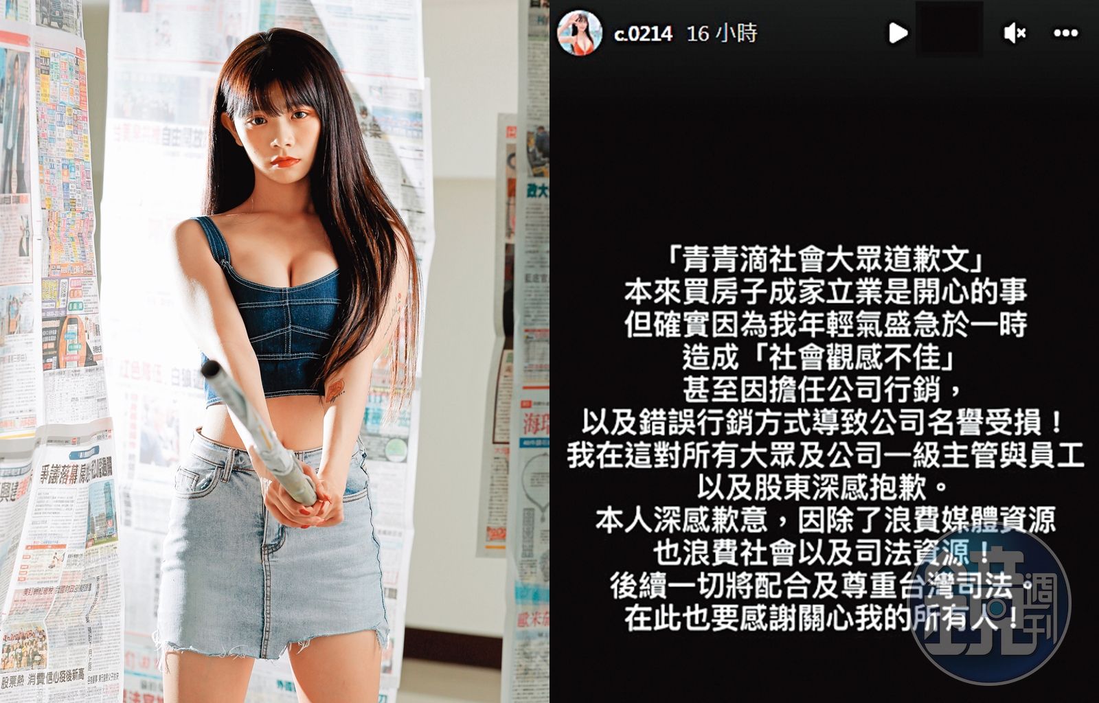 對此,青青似乎不敵輿論壓力,終於低頭道歉,並且刪除過去社群發文,語帶心虛寫道:「買房子成家立業是開心的事,但確實因為我年輕氣盛急於一時,造成社會觀感不佳,甚至因擔任公司行銷,以及錯誤行銷方式,導致公司名譽受損,我在這對所有大眾及公司一級主管與員工,以及股東深感抱歉。」而人氣瞬間泡沬化的她,自然惹來人人喊打。