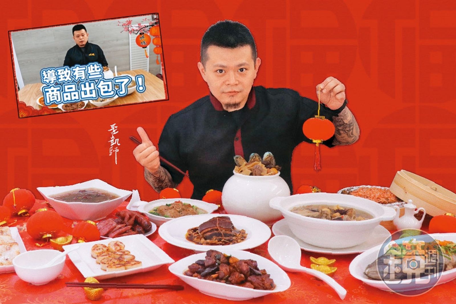 本刊調查,聖凱師2019年10月在「錵鑶居家料理小教室」粉絲團開賣年菜,並在宣傳影片中保證,粉絲拿到的和他示範的商品絕對一樣,影片中聖凱師邊教學加熱,還掛保證菜色包君滿意,五菜二湯並且再加購其他數樣菜色後之全組合賣3,880元,吸引大批粉絲搶購。